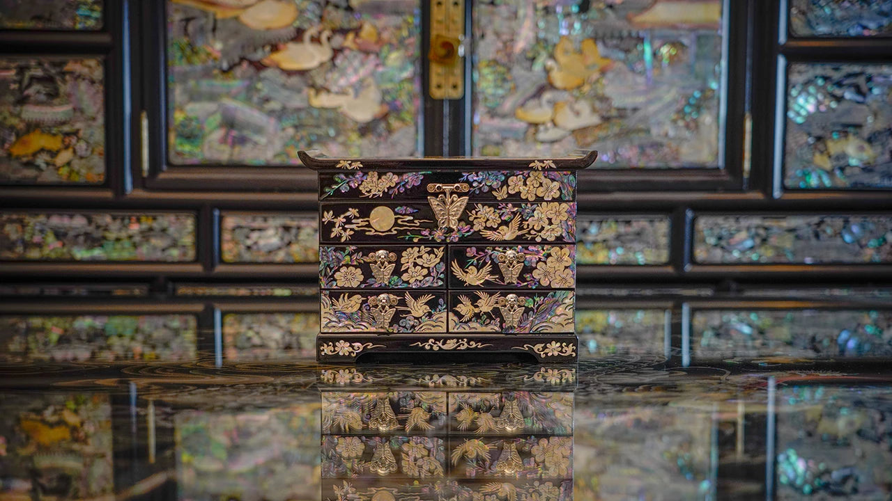 Mother-of-Pearl Crane Jewelry Box with Pine Tree & 4 Flet Drawers