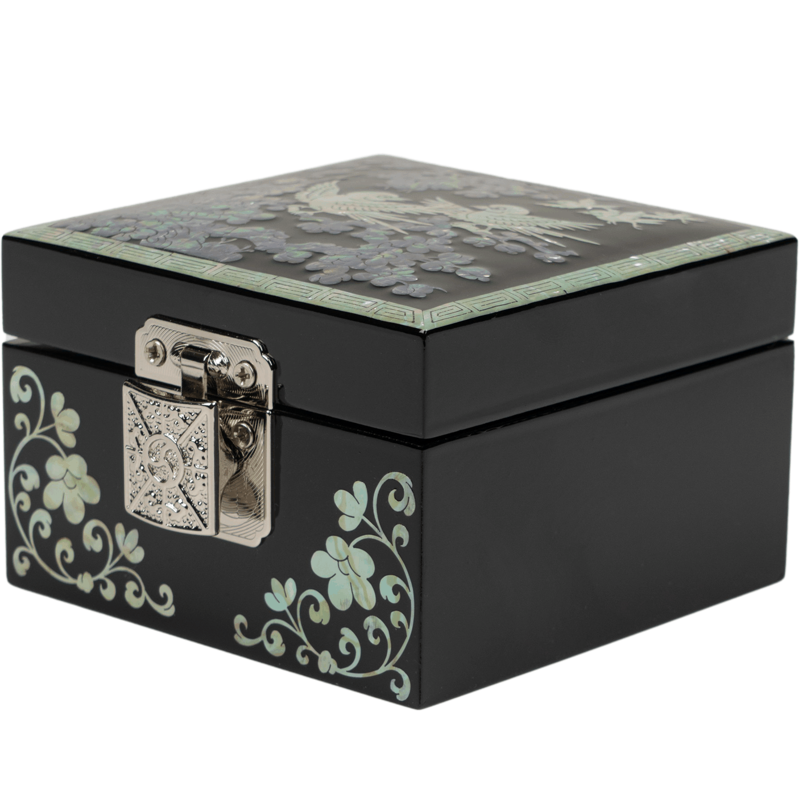 Uncover the allure of Korean artisan craftsmanship with this captivating jewelry box. The intricate mother-of-pearl design featuring birds and florals against a deep black background radiates sophistication. With a plush red velvet interior, it safeguards your precious jewels with style. A unique masterpiece, it's perfect for personal indulgence or as a cherished gift.