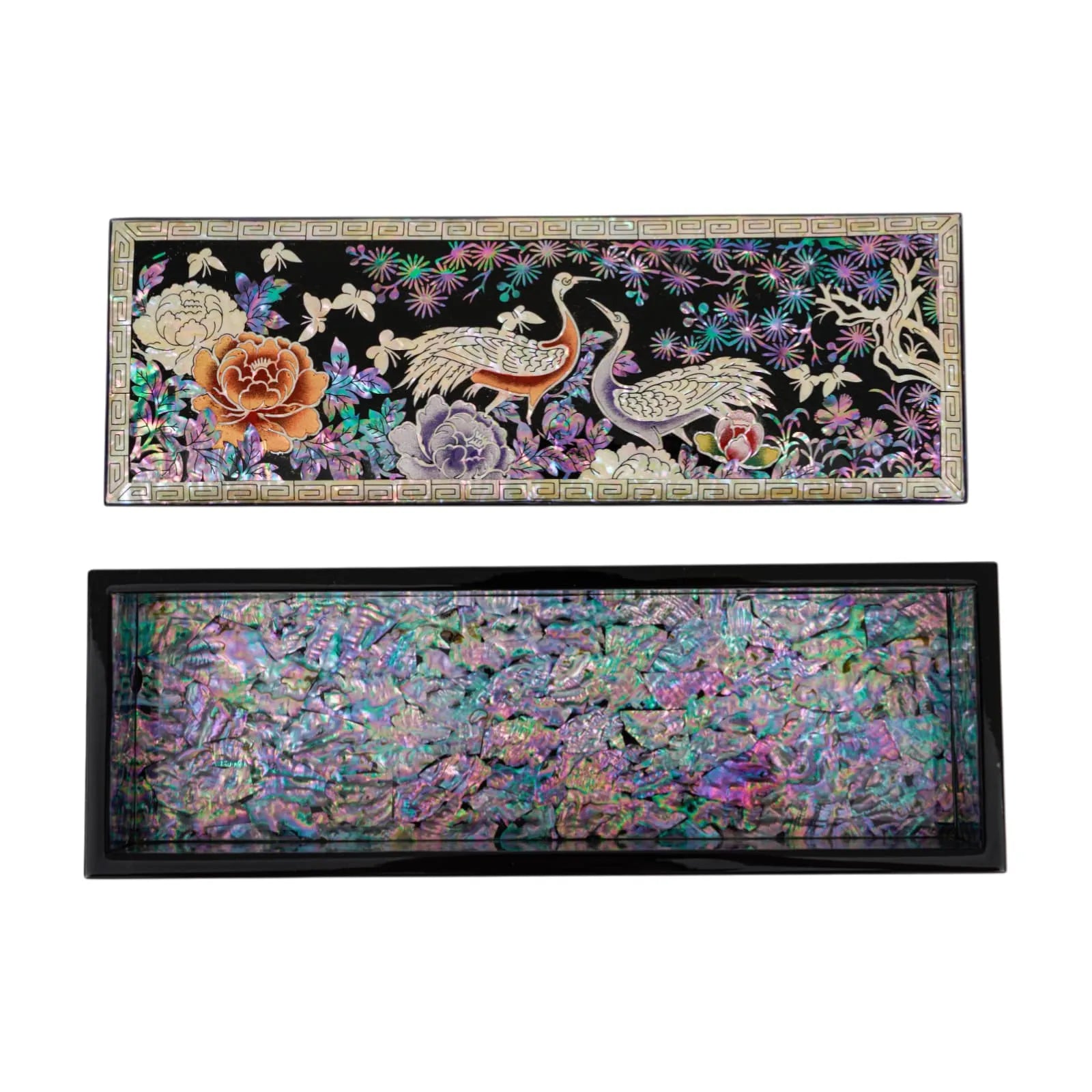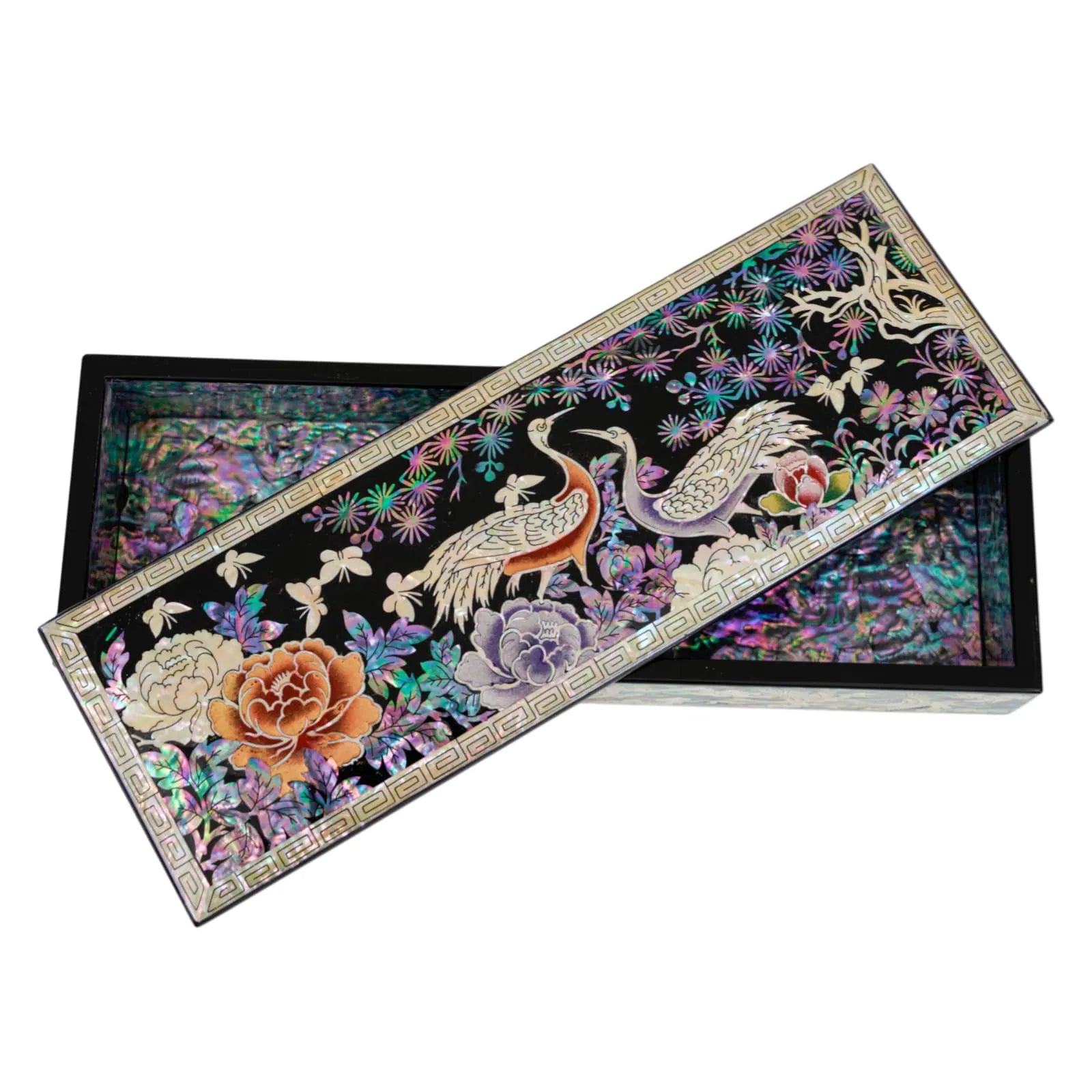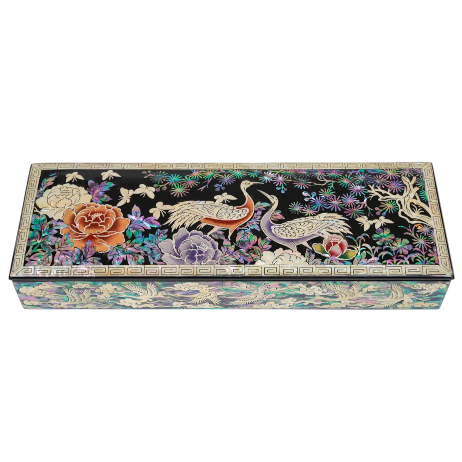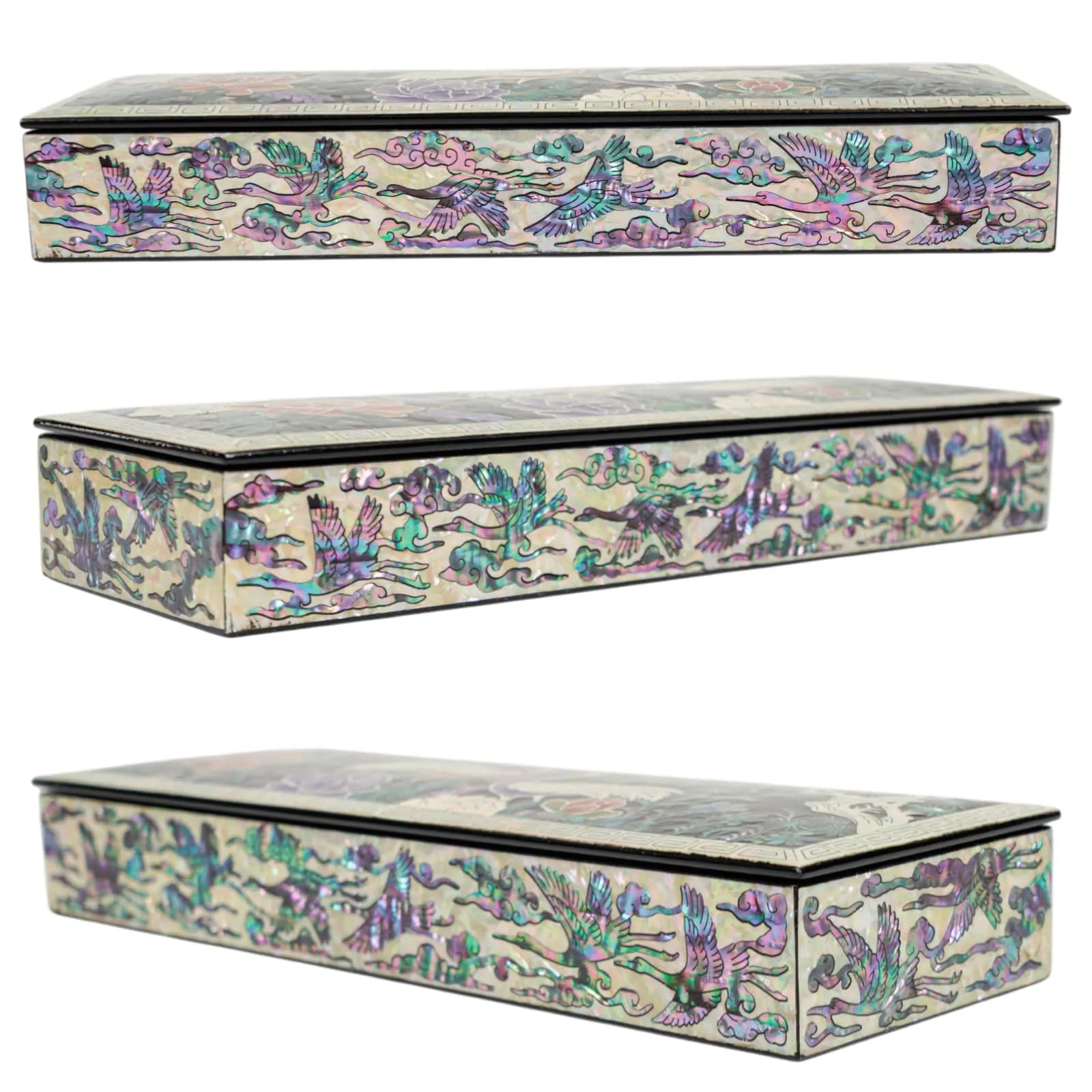 Each side tells its own story, wrapped in iridescent flying cranes and finished with a classic geometric border. Whether placed on a desk or dressing table, it elevates both function and form.