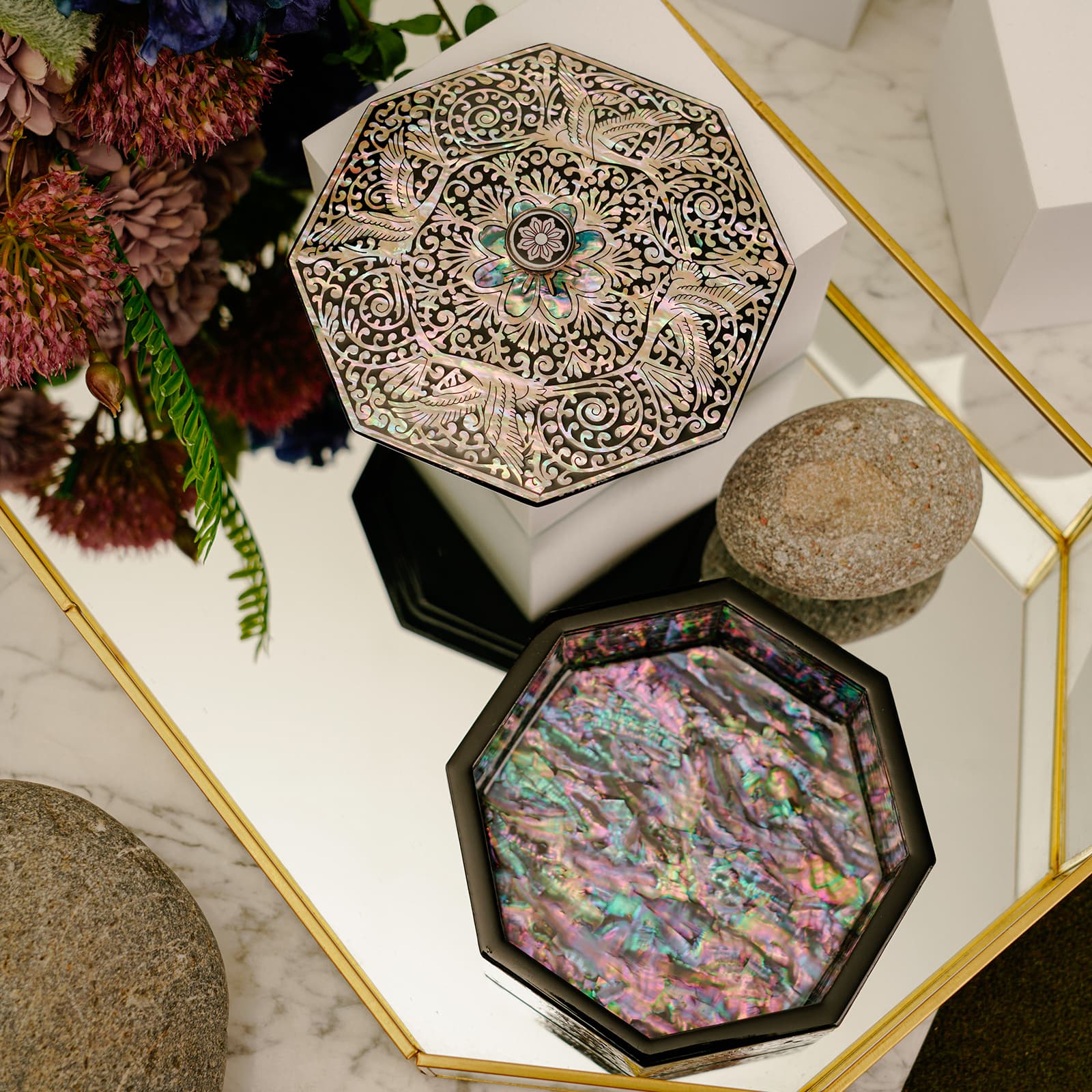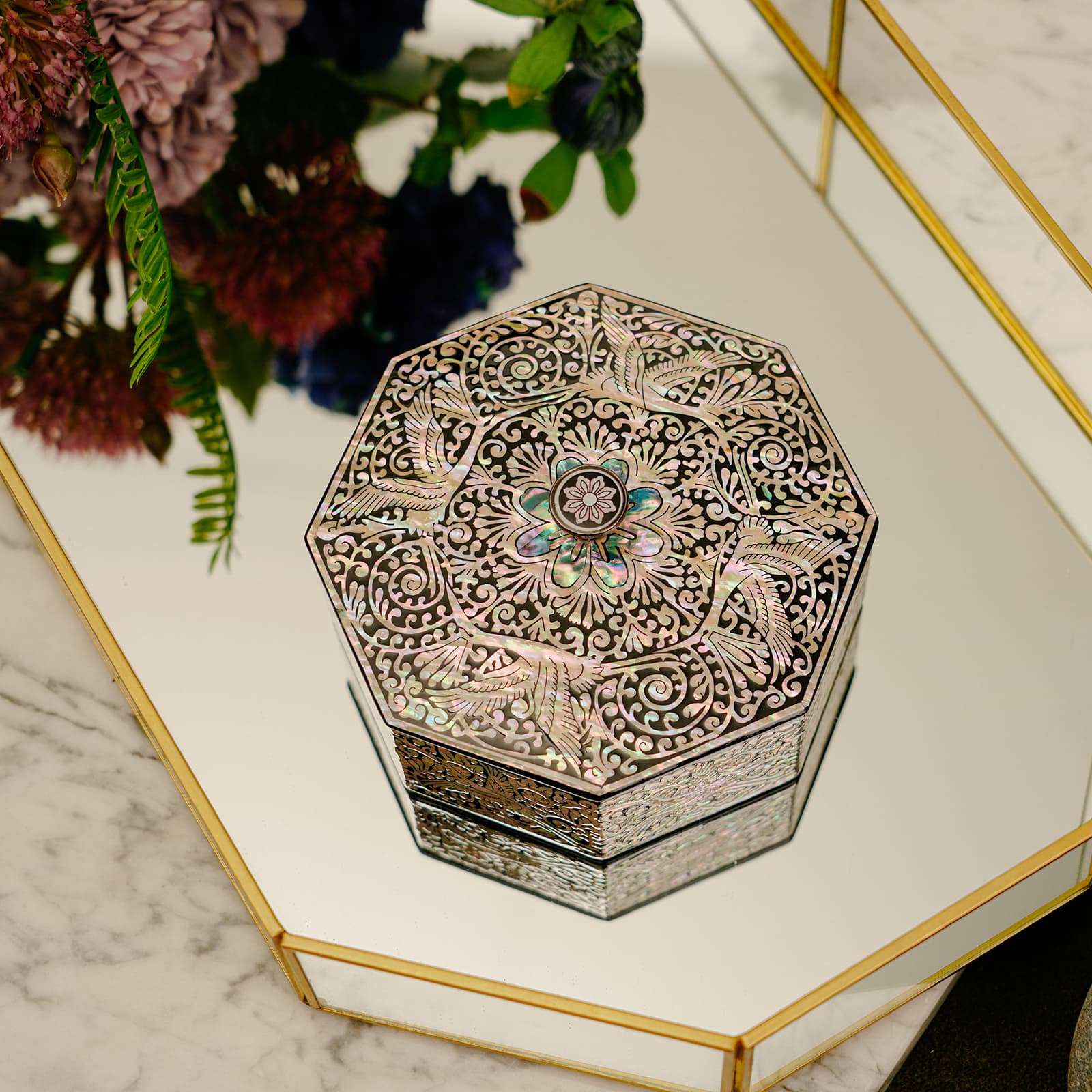With its seashell inlaid mother of pearl, this beautiful trinket box is a perfect solution for keeping rings, bracelets and necklaces and earrings together in one place. It is a stunning gift to consider for special occasions too!