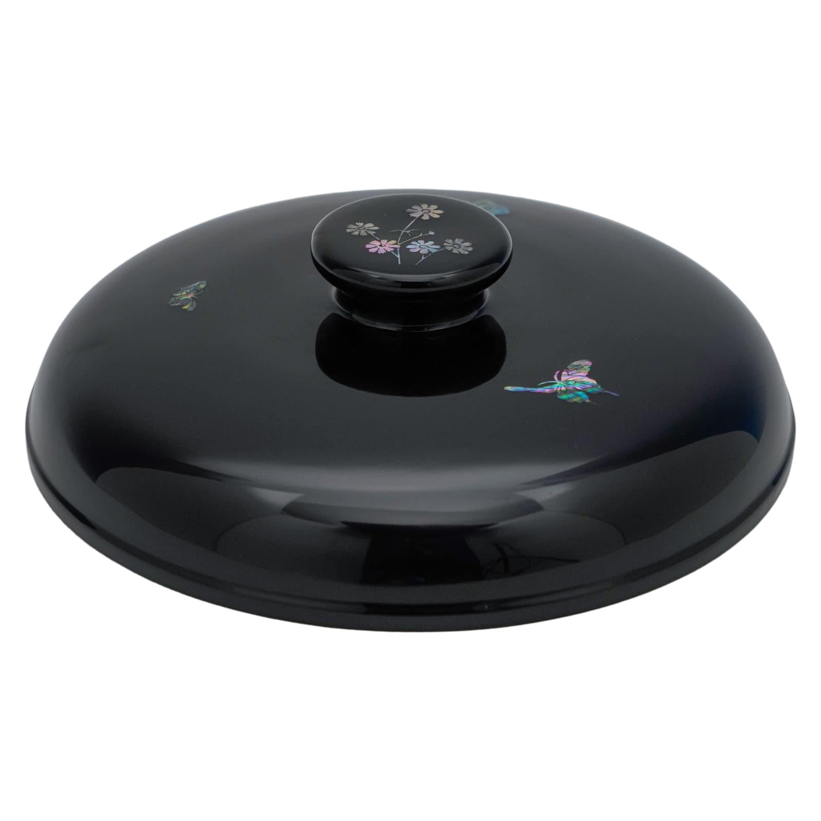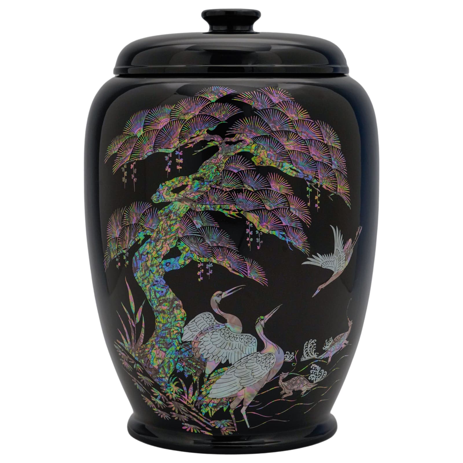 Elegant Black Container with Mother-of-Pearl Cranes and Pine Design
