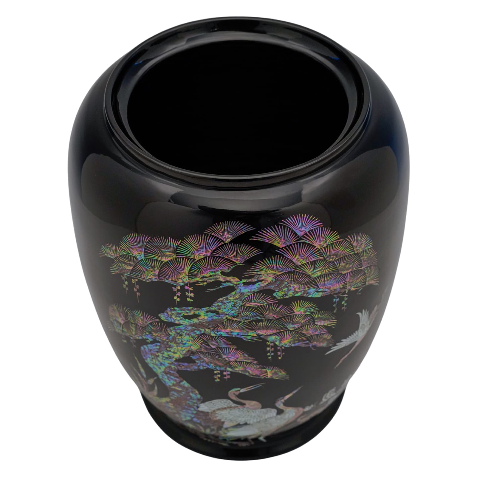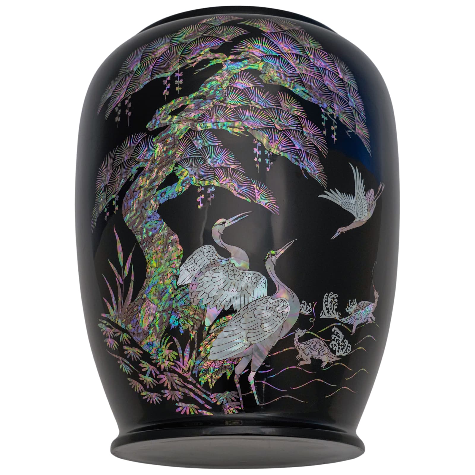 Admire our elegant black decorative jar, crafted from Paulownia wood and lacquered inside, beautifully adorned with mother-of-pearl inlay depicting cranes and pine trees. This versatile handcrafted piece is perfect for storing kitchen essentials, as a unique flower vase, or as an artistic home decor item. Ideal for gifts and collectors.