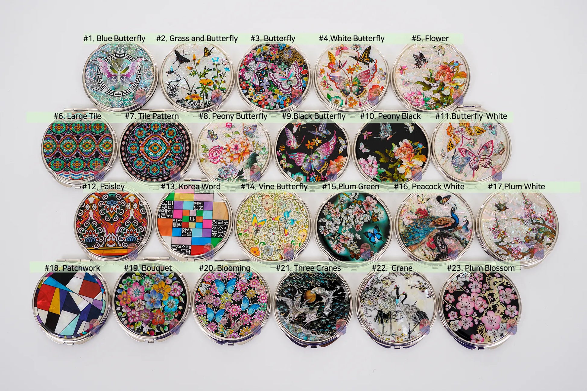 A beautiful compact mirror blooming with delicate pink cherry blossoms on a shimmering mother-of-pearl background.