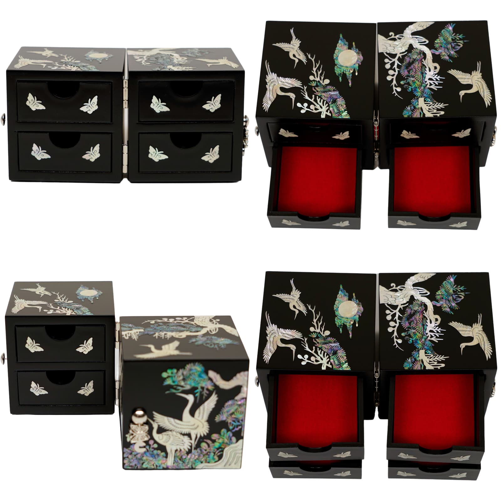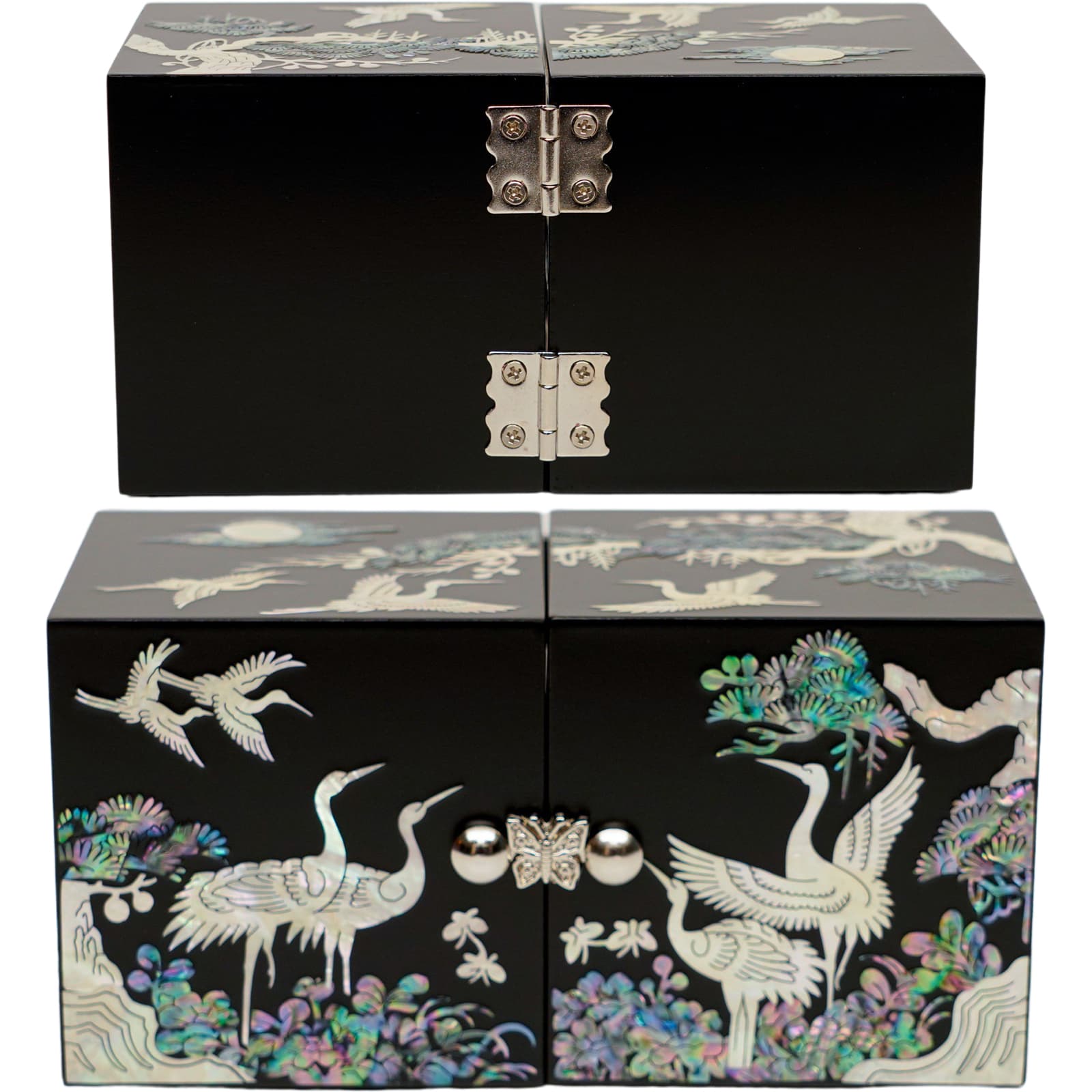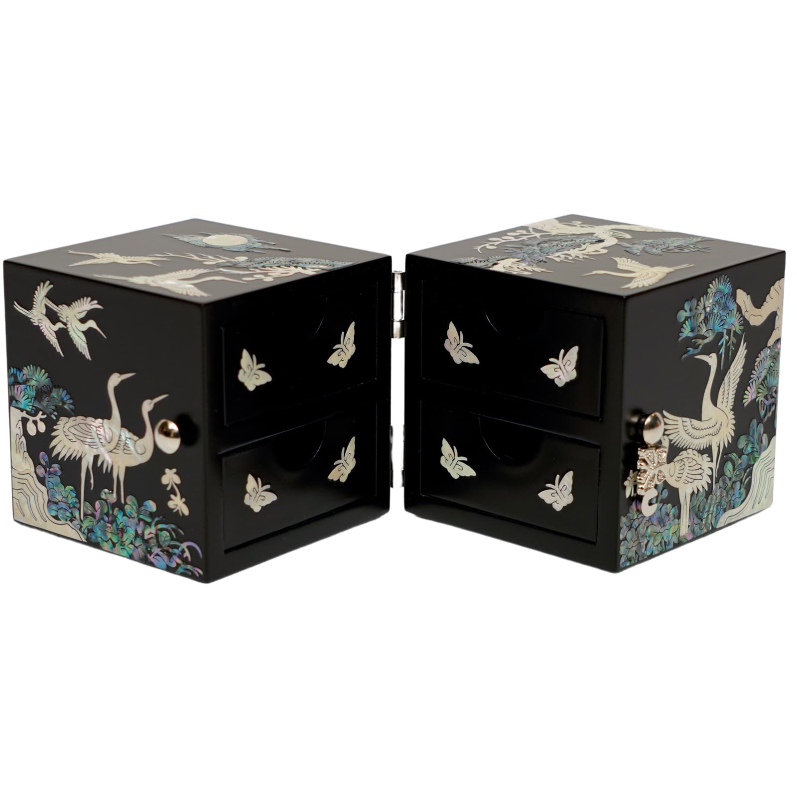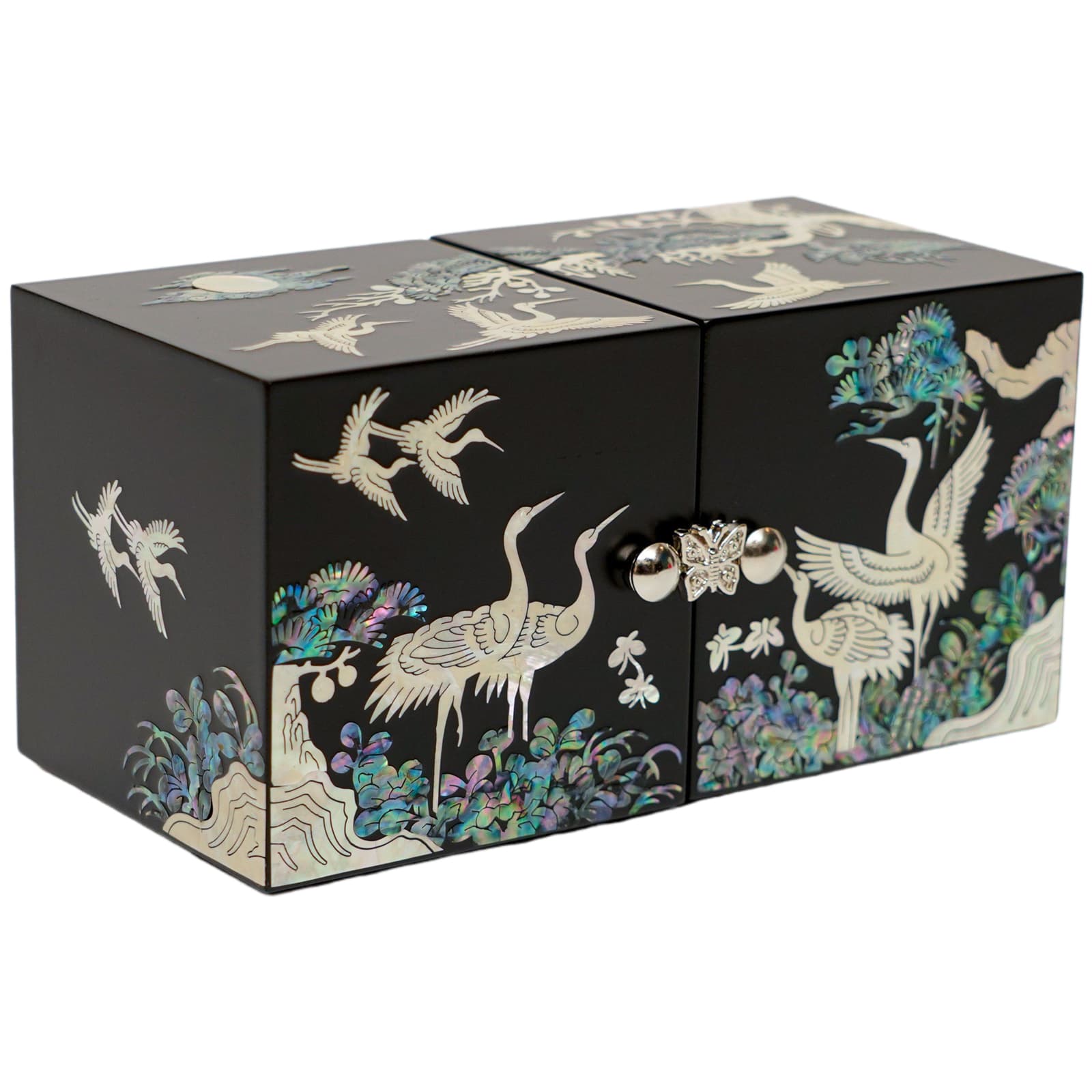 Open up the beautiful cubic design to reveal a multifunctional design that is interesting and unique. So beautiful with its crane, pine tree and mother of pearl designs, this jewelry box features four drawers for all your special items - you will love how it effortlessly slides open and close.