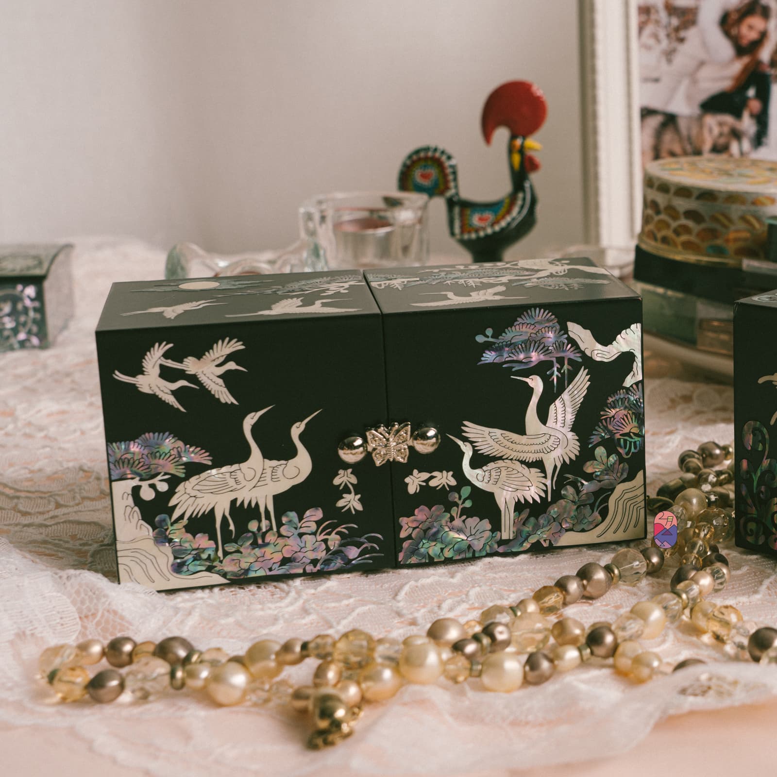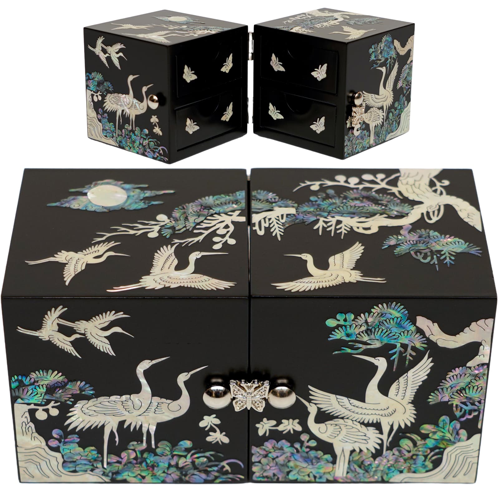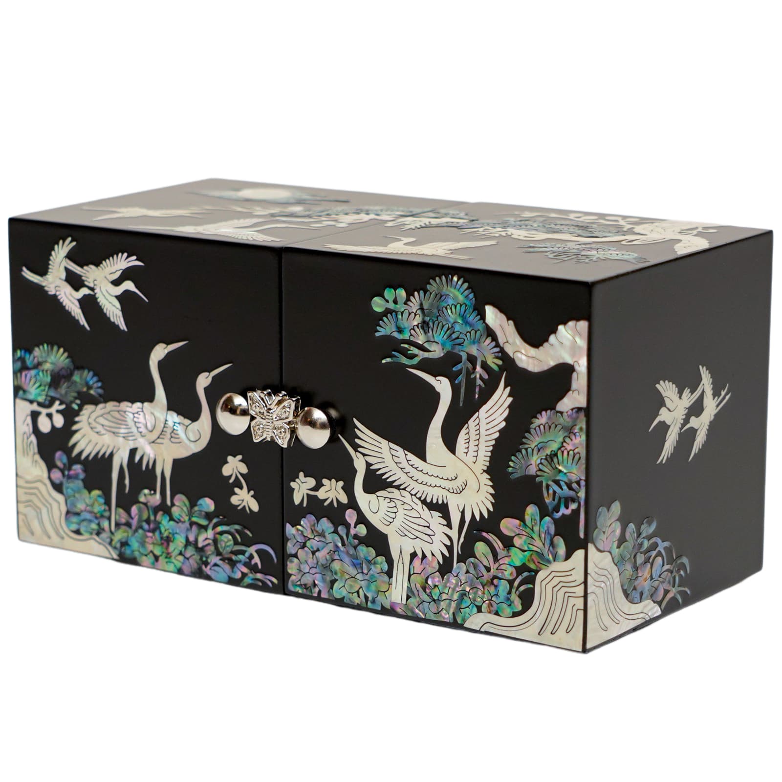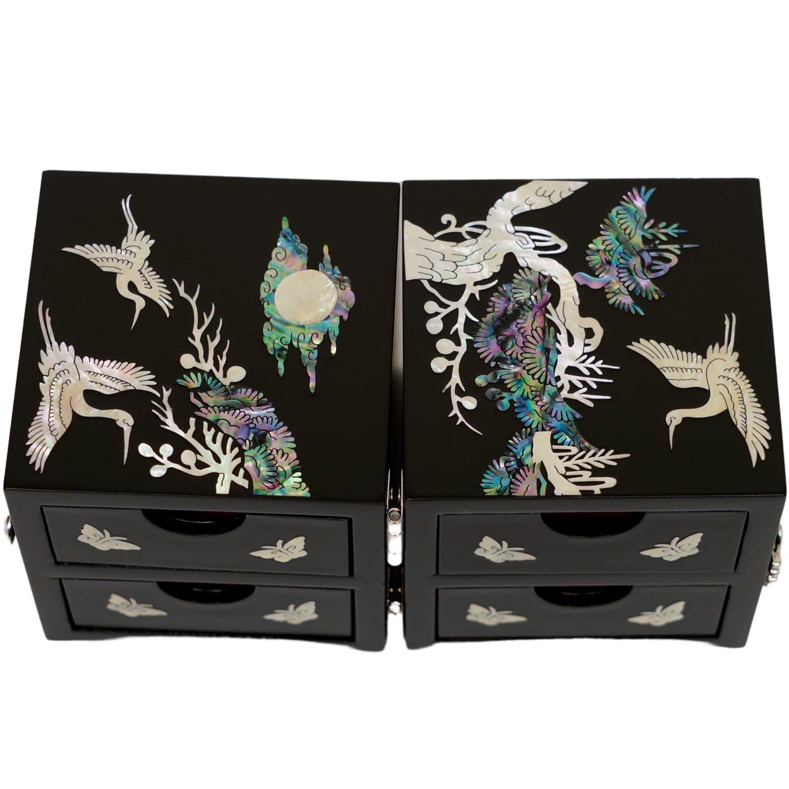 Open up the beautiful cubic design to reveal a multifunctional design that is interesting and unique. So beautiful with its crane, pine tree and mother of pearl designs, this jewelry box features four drawers for all your special items - you will love how it effortlessly slides open and close.