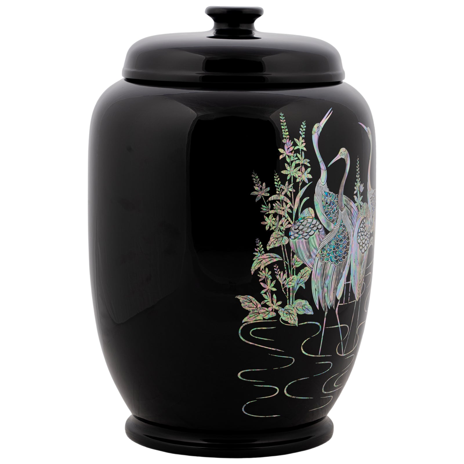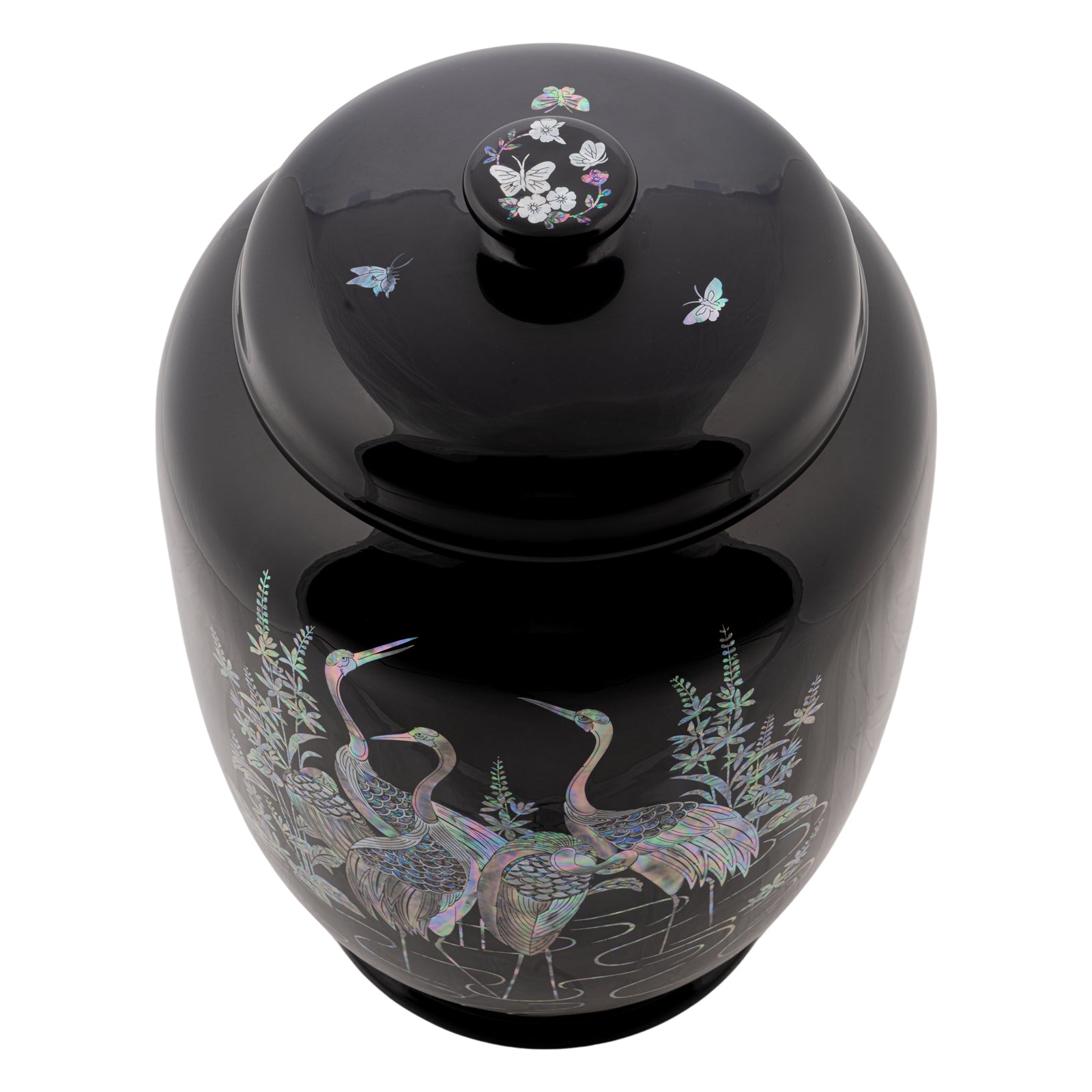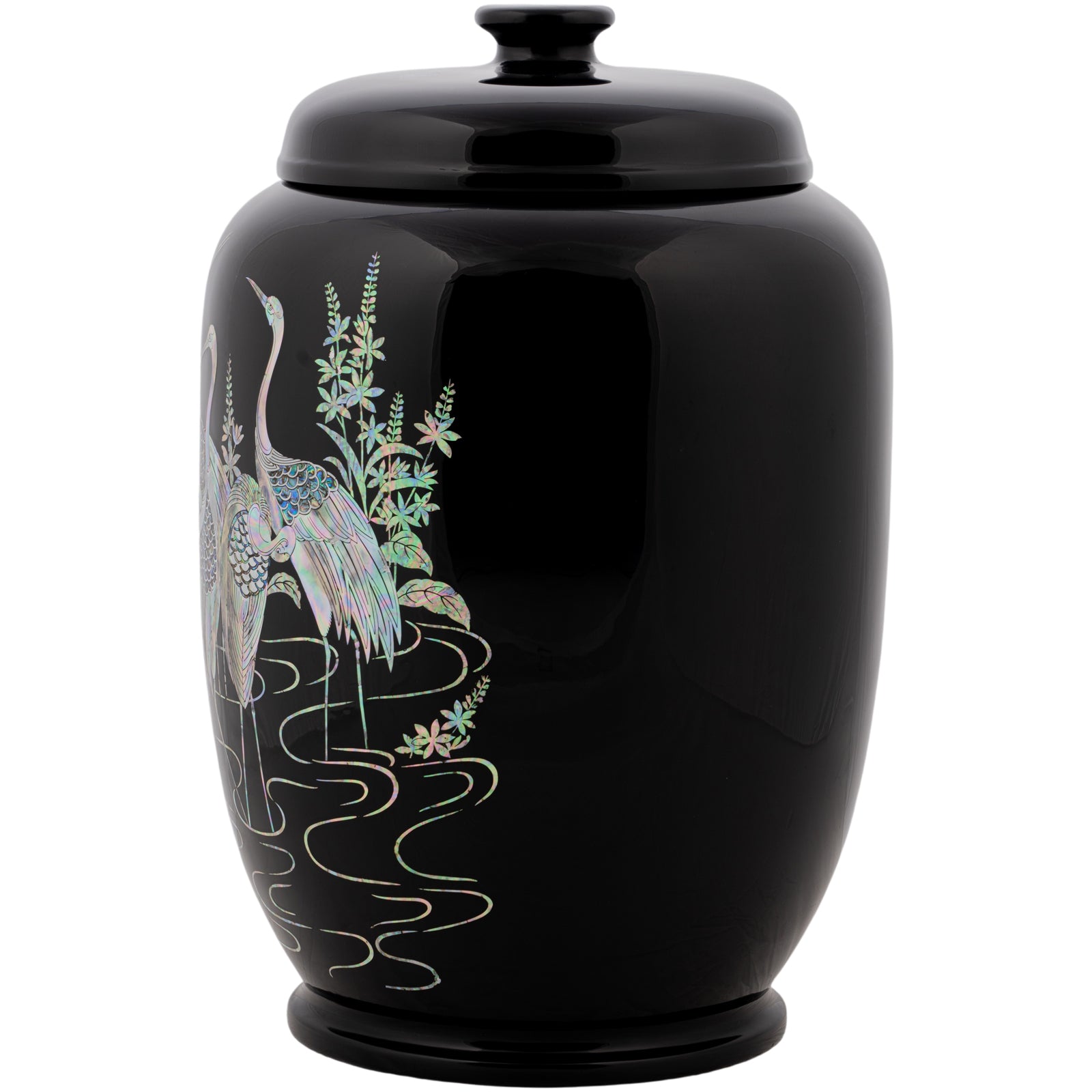 Admire our elegant black decorative jar, crafted from Paulownia wood and lacquered inside, beautifully adorned with mother-of-pearl inlay depicting cranes and pine trees. This versatile handcrafted piece is perfect for storing kitchen essentials, as a unique flower vase, or as an artistic home decor item. Ideal for gifts and collectors.