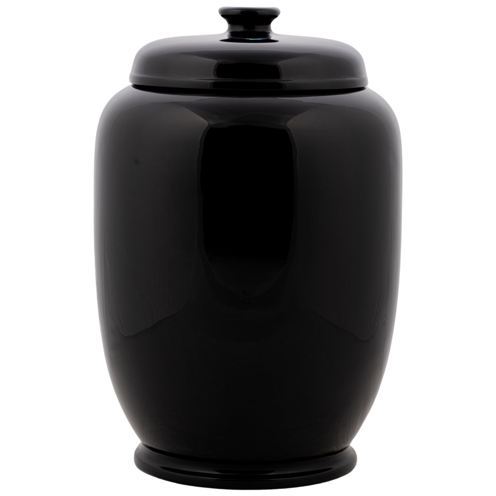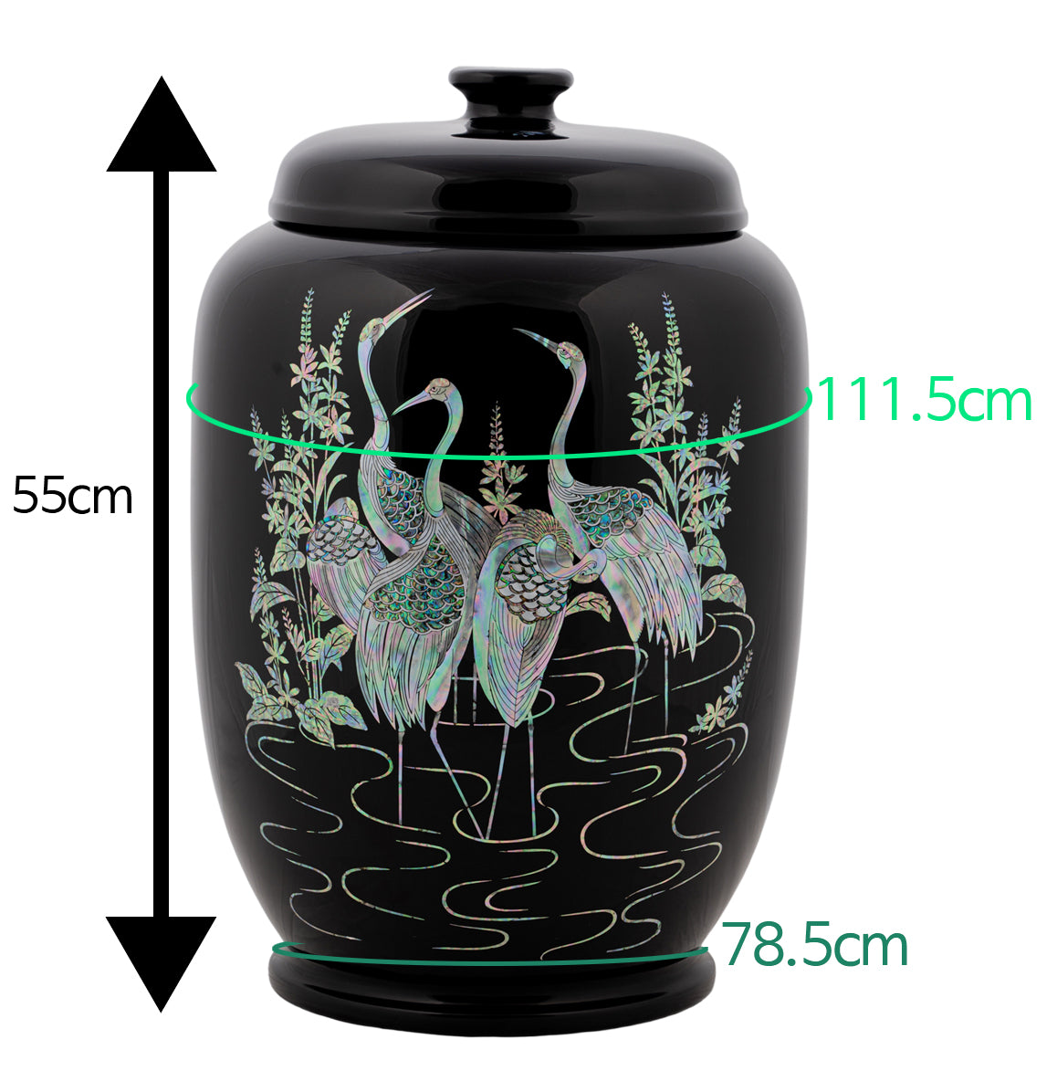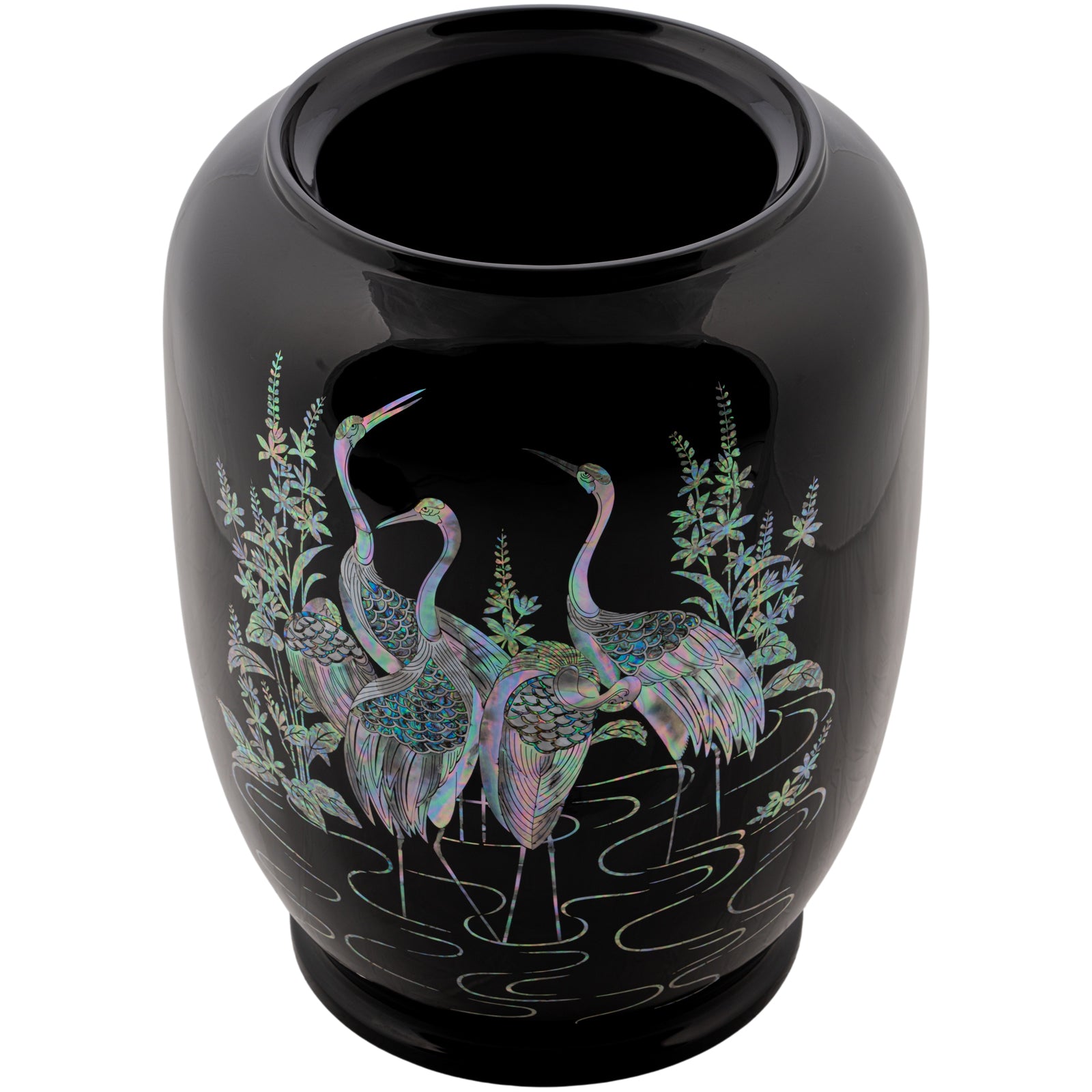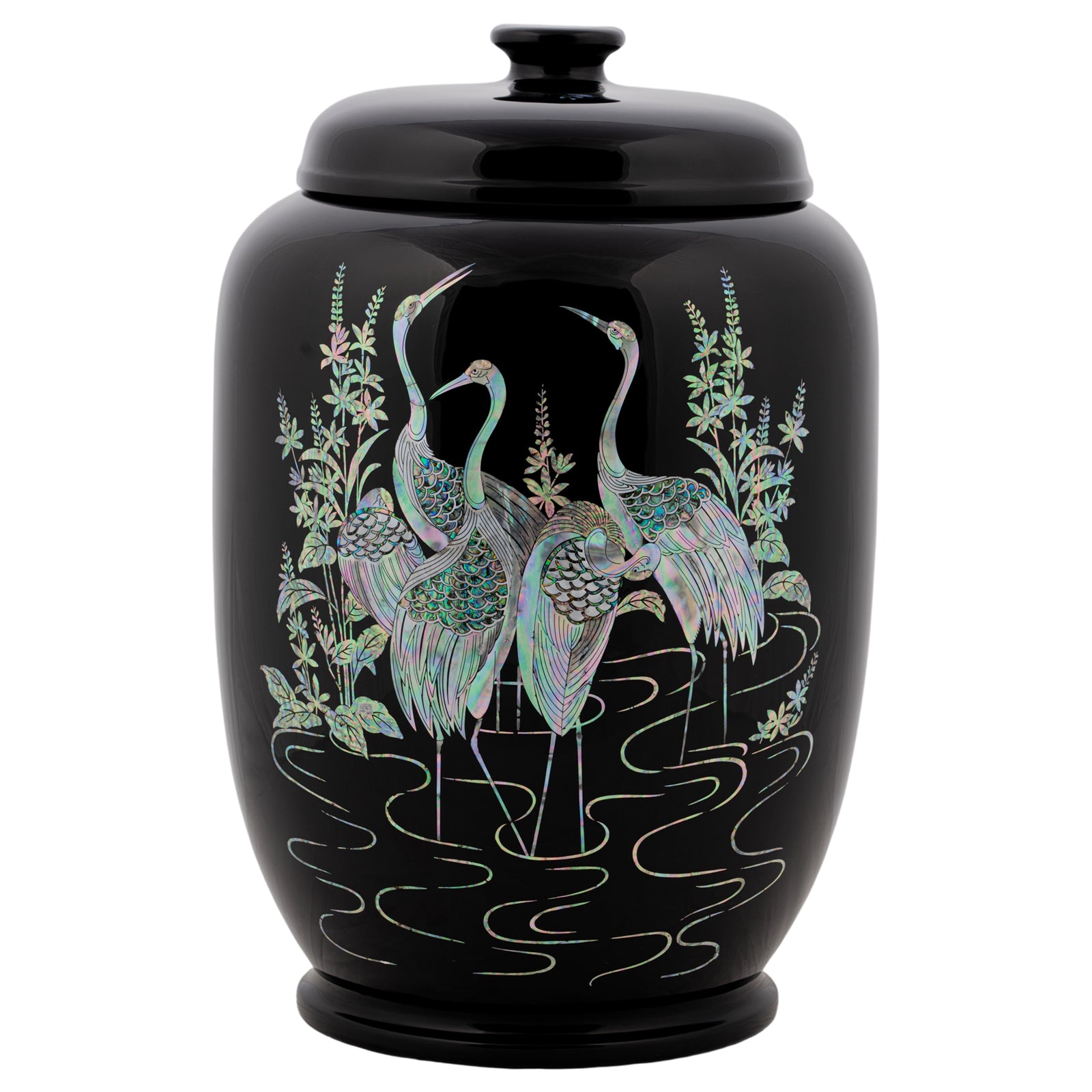Admire our elegant black decorative jar, crafted from Paulownia wood and lacquered inside, beautifully adorned with mother-of-pearl inlay depicting cranes and pine trees. This versatile handcrafted piece is perfect for storing kitchen essentials, as a unique flower vase, or as an artistic home decor item. Ideal for gifts and collectors.