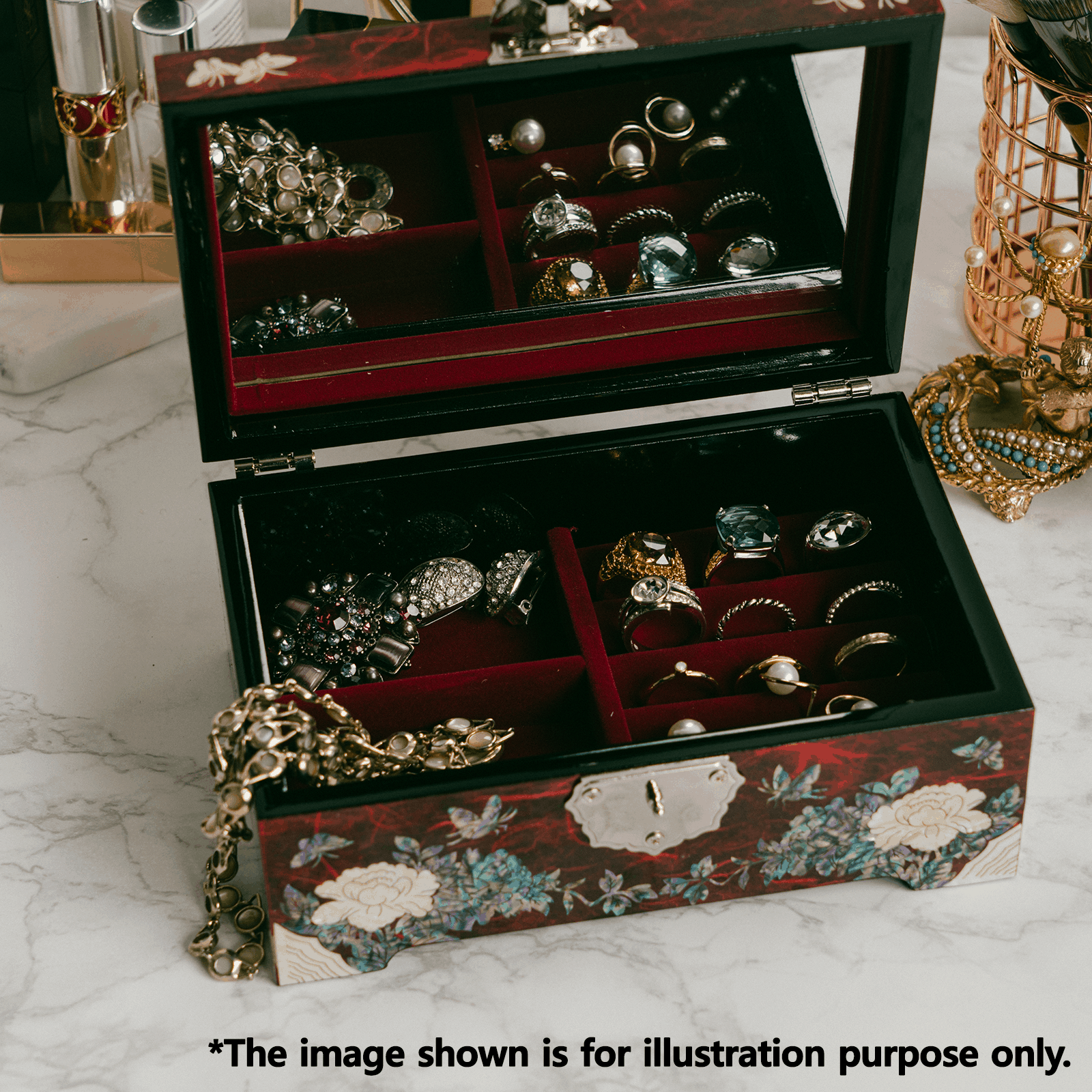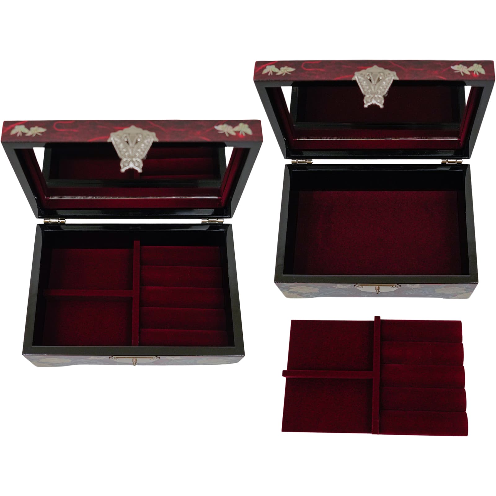 Discover the beauty of our handcrafted mother-of-pearl jewelry box, adorned with intricate floral designs. A perfect blend of luxury and functionality, it features a plush red velvet interior with a removable tray for organizing your precious items. Shop now for an exquisite storage solution.