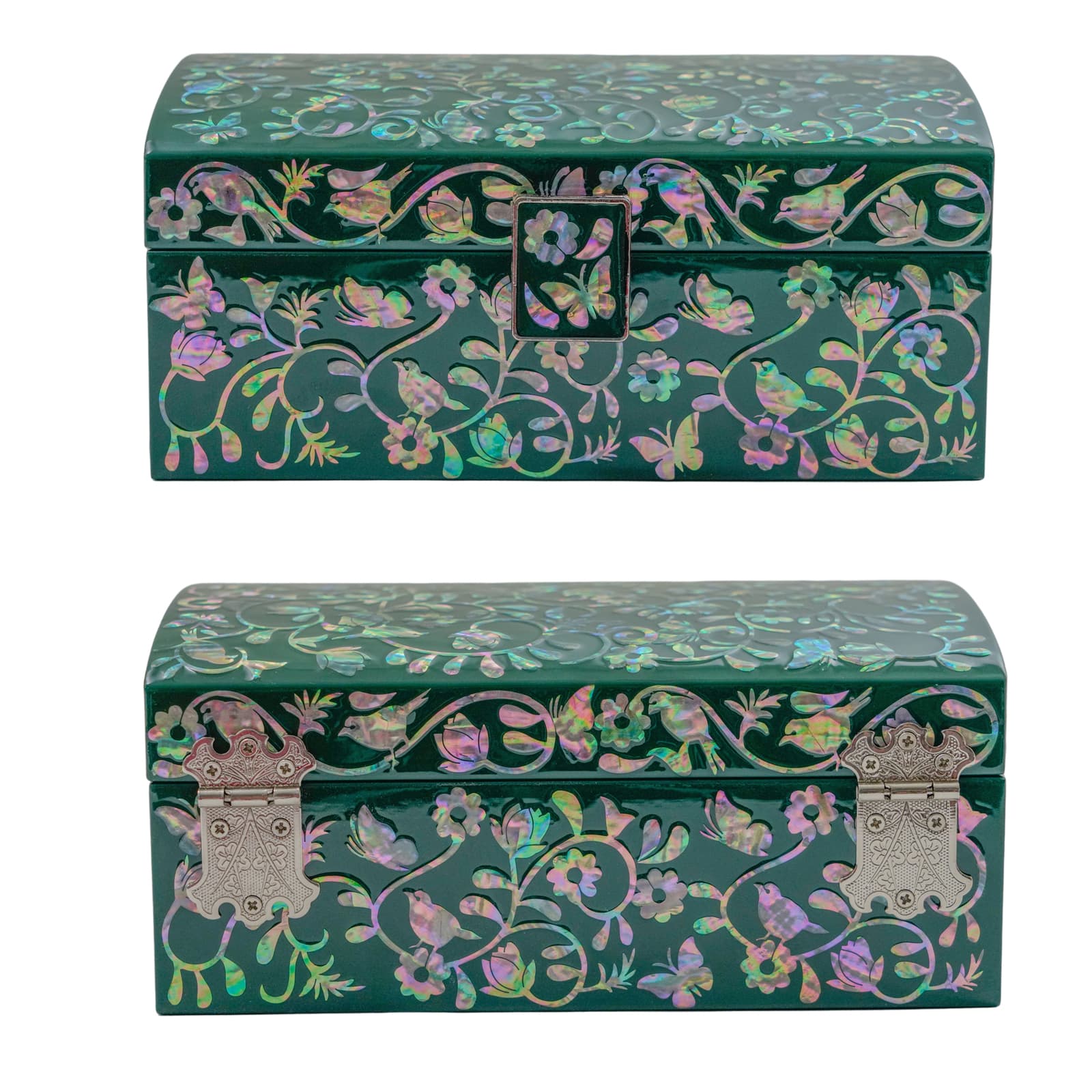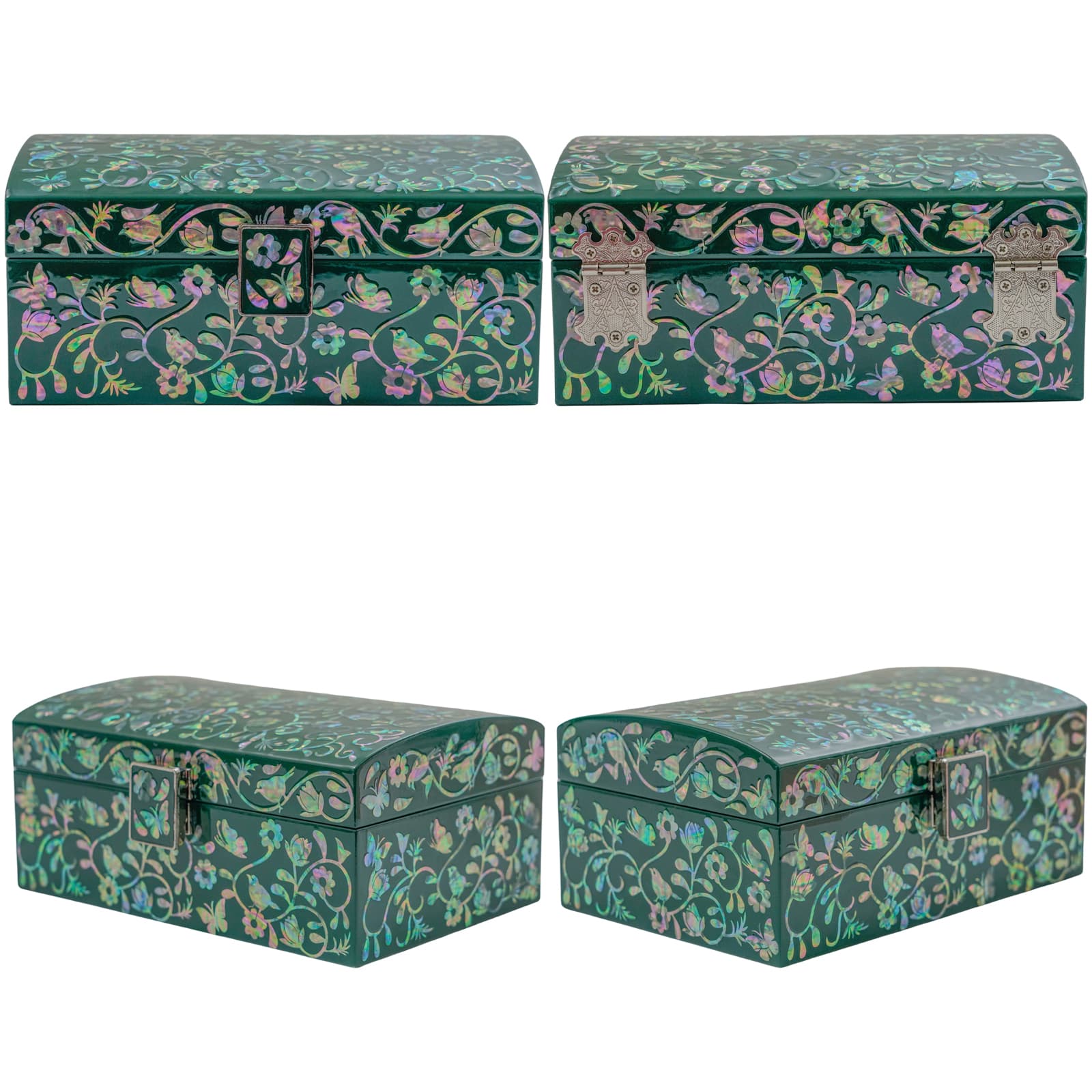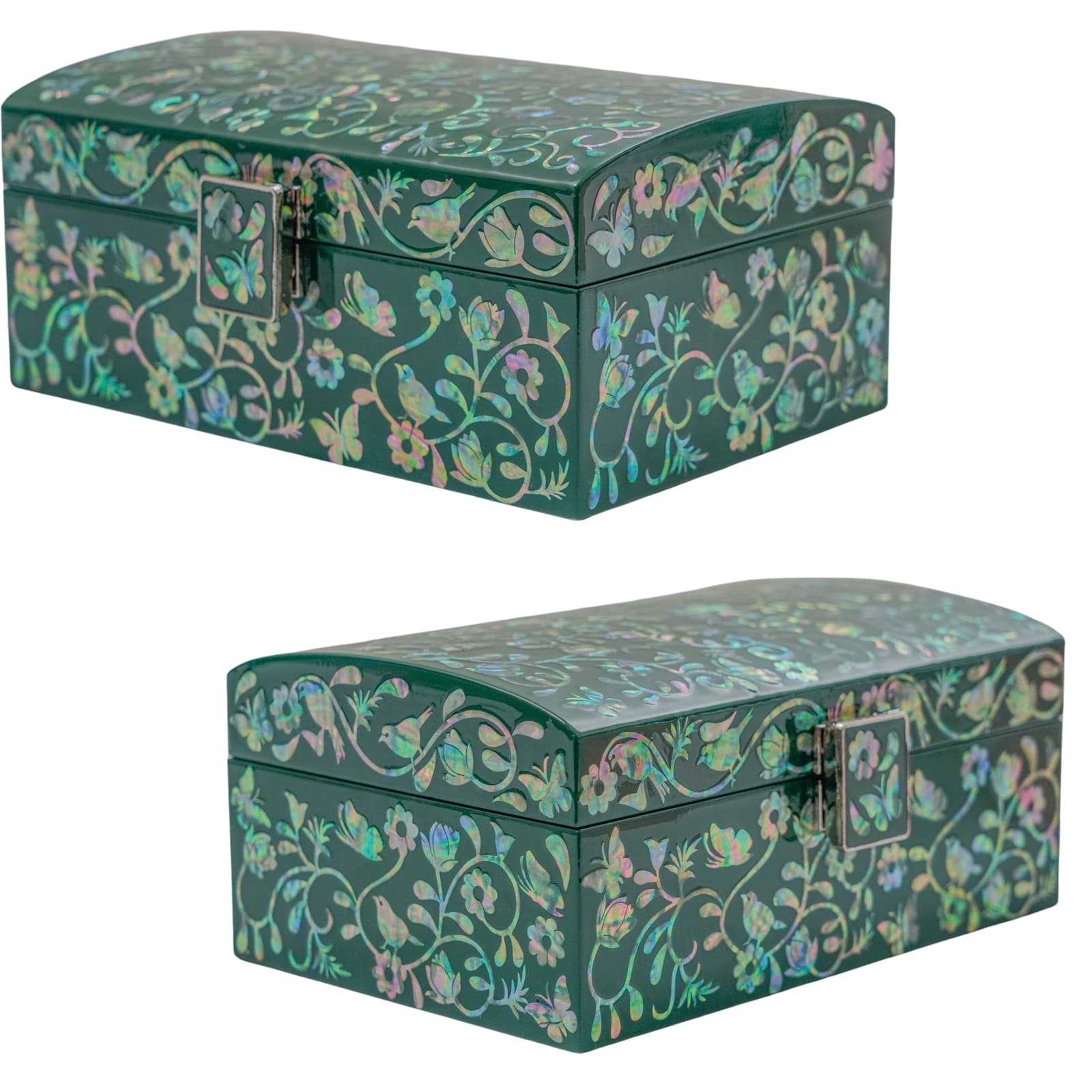 Introducing our Dark Green Mother of Pearl Wooden Box, a piece that combines visual allure with practical utility. This exquisite wooden box is adorned with meticulously detailed mother of pearl inlays, set against a deep, opulent dark green background, making it an impressive addition to your decor or an elegant gift choice.