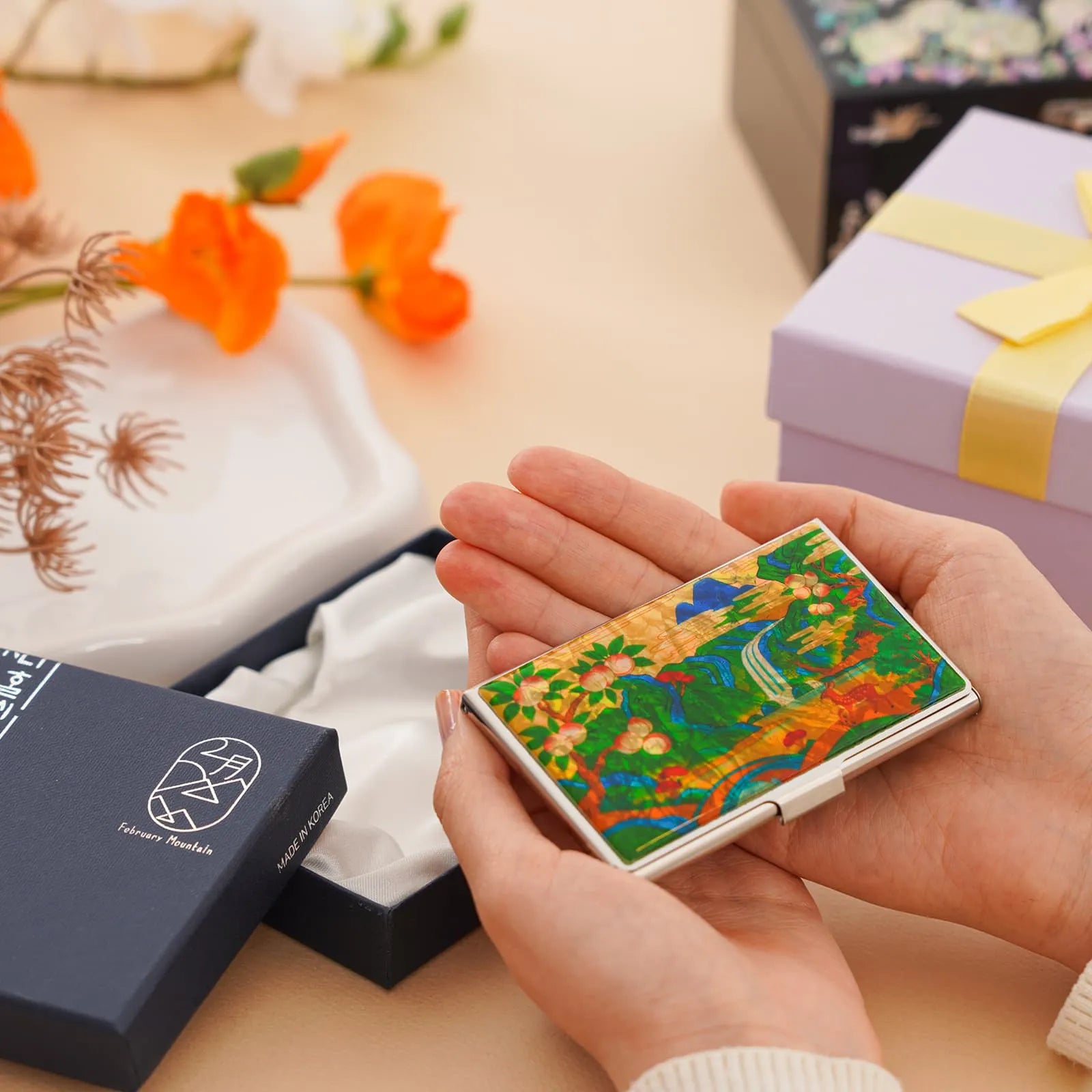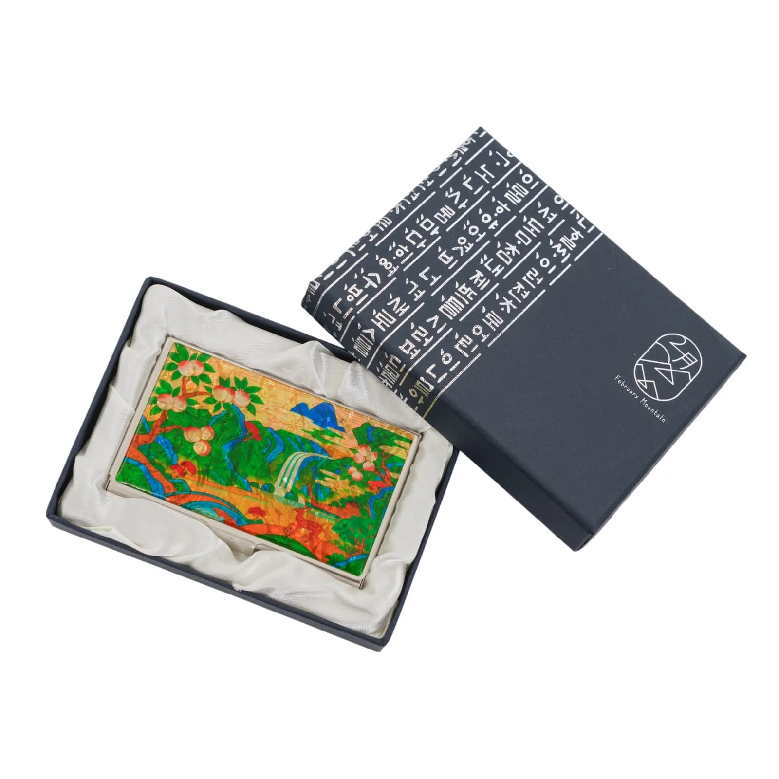 Inspired by traditional Korean court paintings, this vibrant card case features a radiant mountain, flowing waterfalls, peach trees, and deer—symbols of longevity and peace. The brilliant colors and luminous mother-of-pearl finish bring depth and energy to the scene, making it both meaningful and eye-catching. Compact yet full of character, this card holder comes in a satin-lined gift box, perfect for collectors, professionals, or anyone who appreciates cultural artistry.