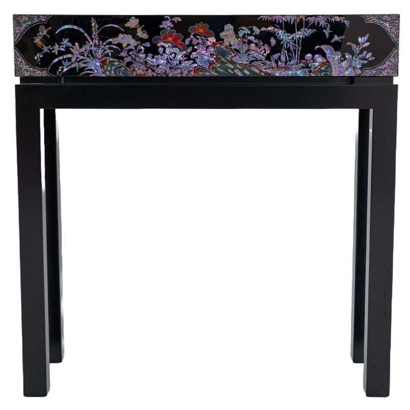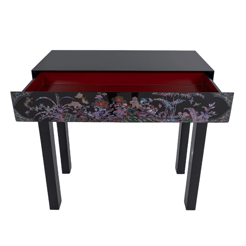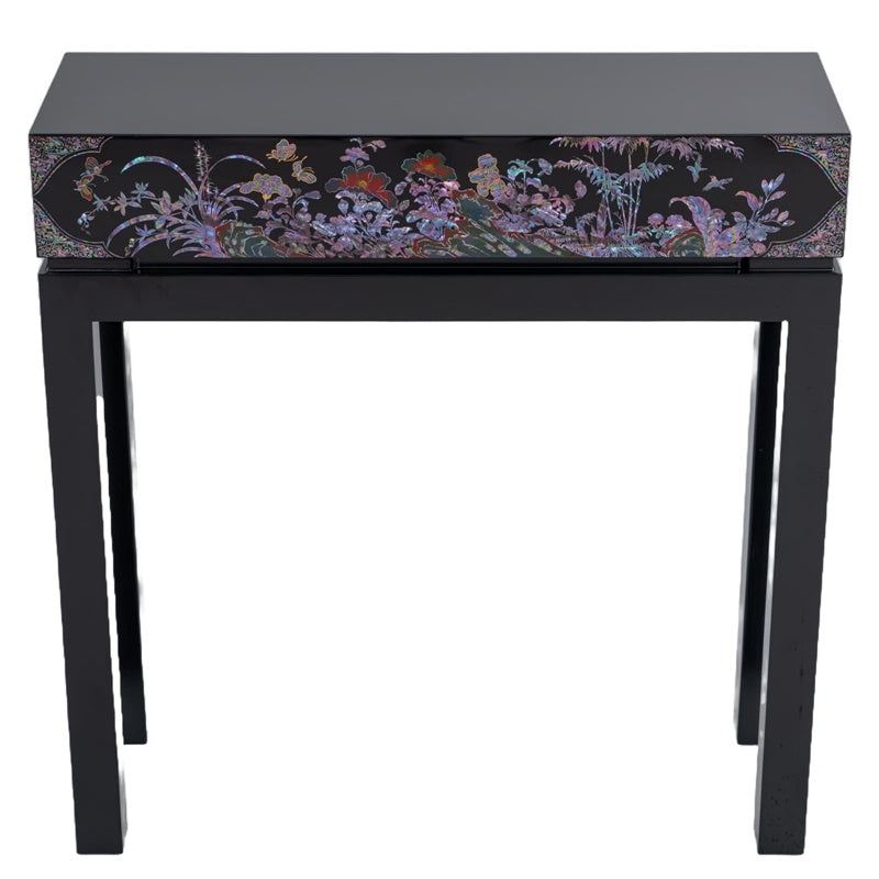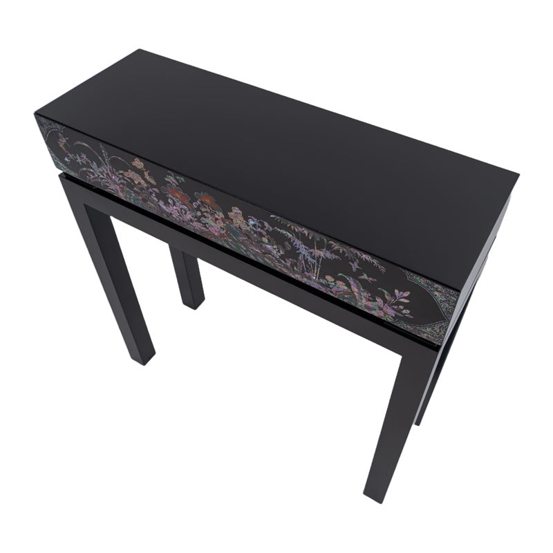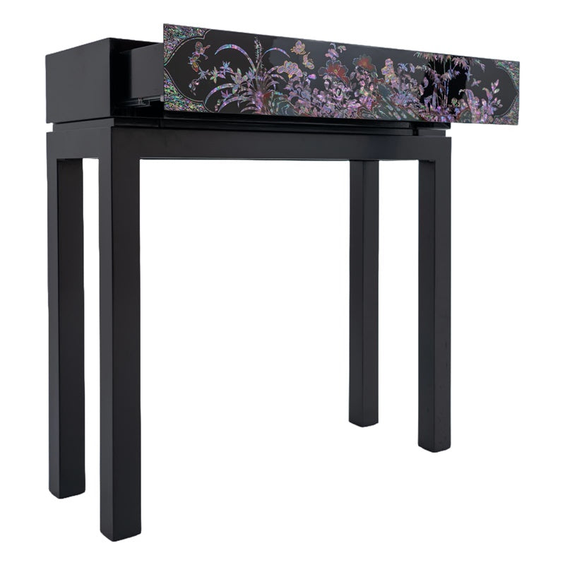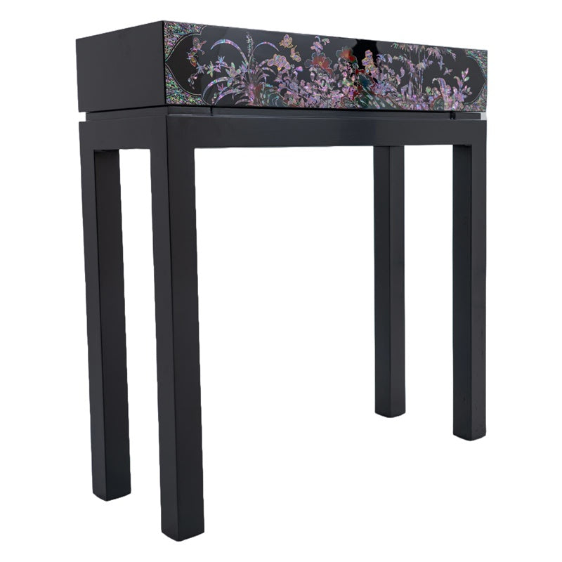 Introduce a striking blend of traditional Korean artistry and contemporary elegance with this handcrafted mother-of-pearl console table. Featuring a deep black lacquer finish and adorned with breathtaking floral and butterfly inlay, this piece is perfect for your entryway, hallway, or living space.