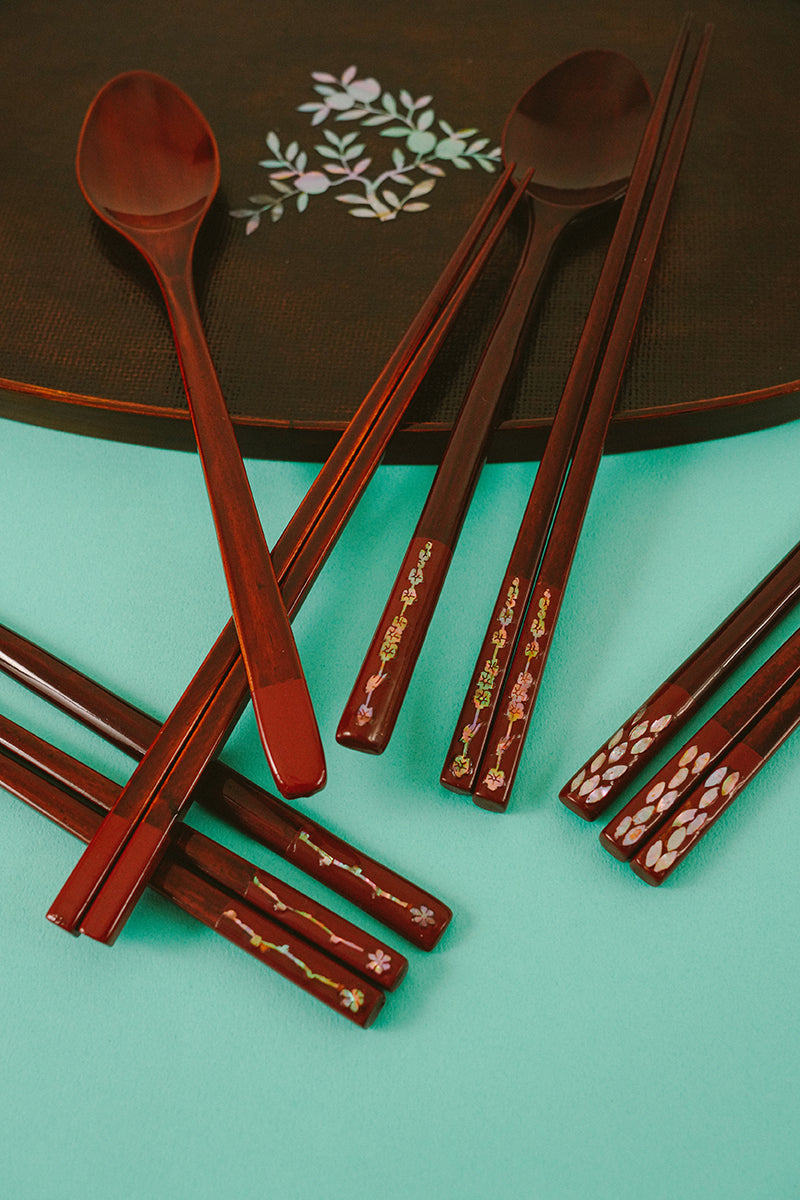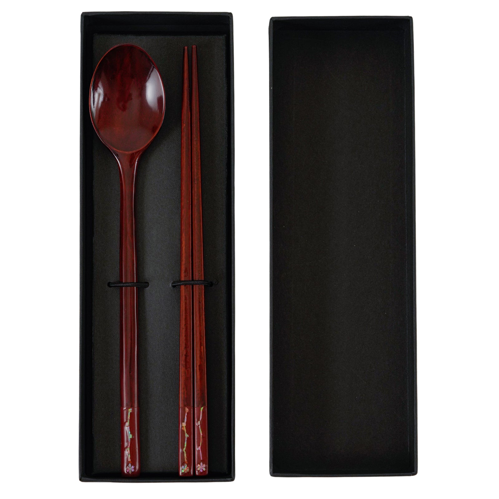 Make your dining experience unique and sophisticated with our Korean-made mother of pearl natural lacquered wooden chopsticks and spoon set!