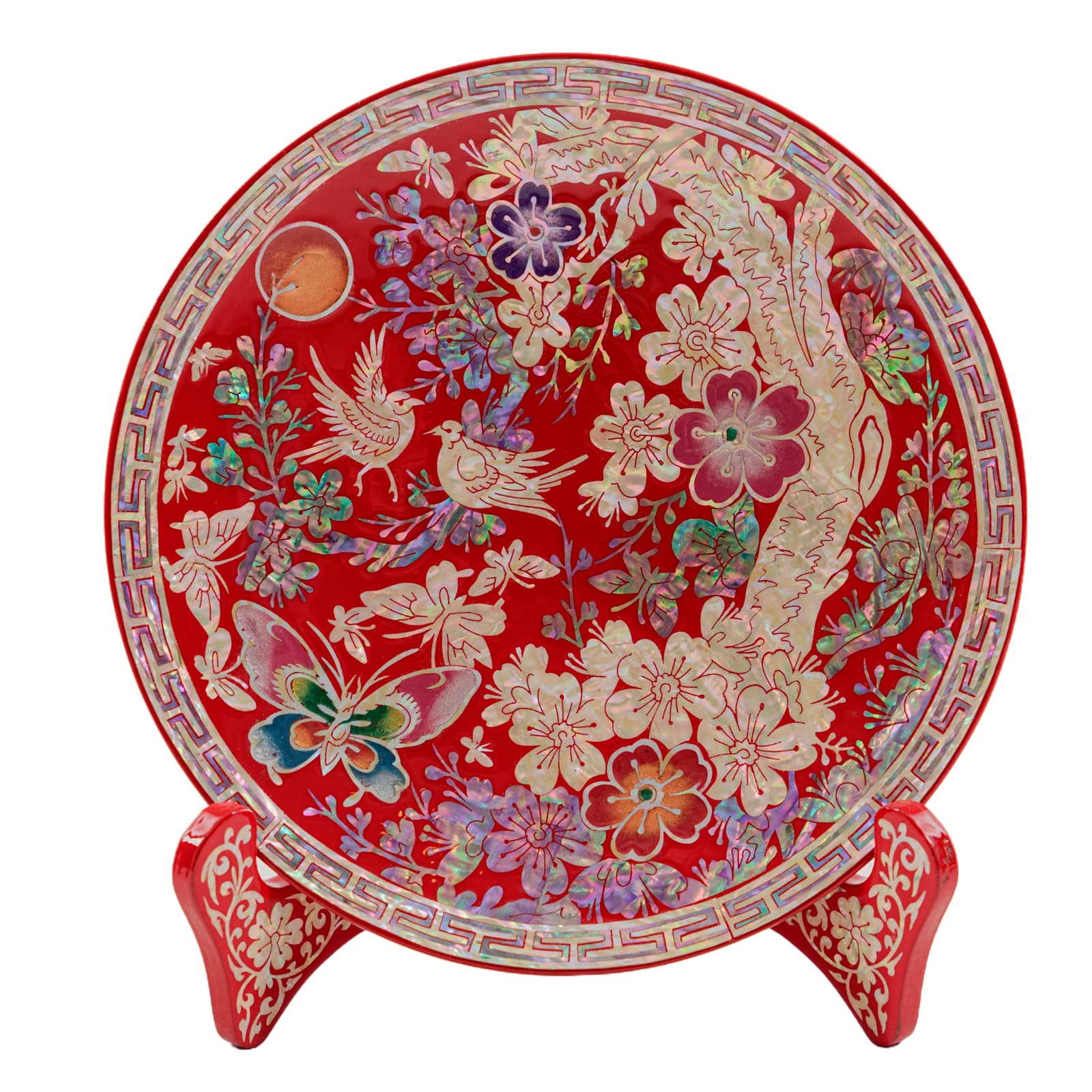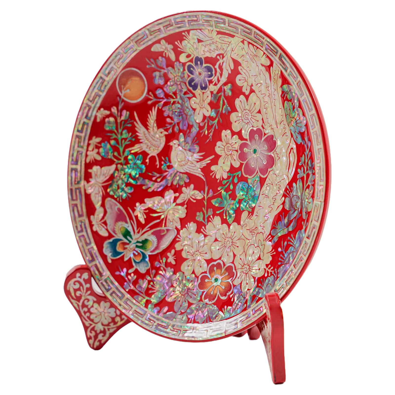 This exquisite decorative plate embodies the elegance of traditional Korean craftsmanship, featuring intricate mother-of-pearl inlay on a lacquered surface. The detailed design showcases a harmonious scene of flowers, birds, and butterflies, symbolizing beauty, prosperity, and harmony. Available in both rich black and vibrant red finishes, this plate adds a touch of sophistication to any space. Each plate is meticulously handcrafted and includes a matching stand, making it perfect for display on a shelf, mantle, or table. Whether you're looking to enhance your home decor or searching for a unique, thoughtful gift, this mother-of-pearl inlay plate is an ideal choice.