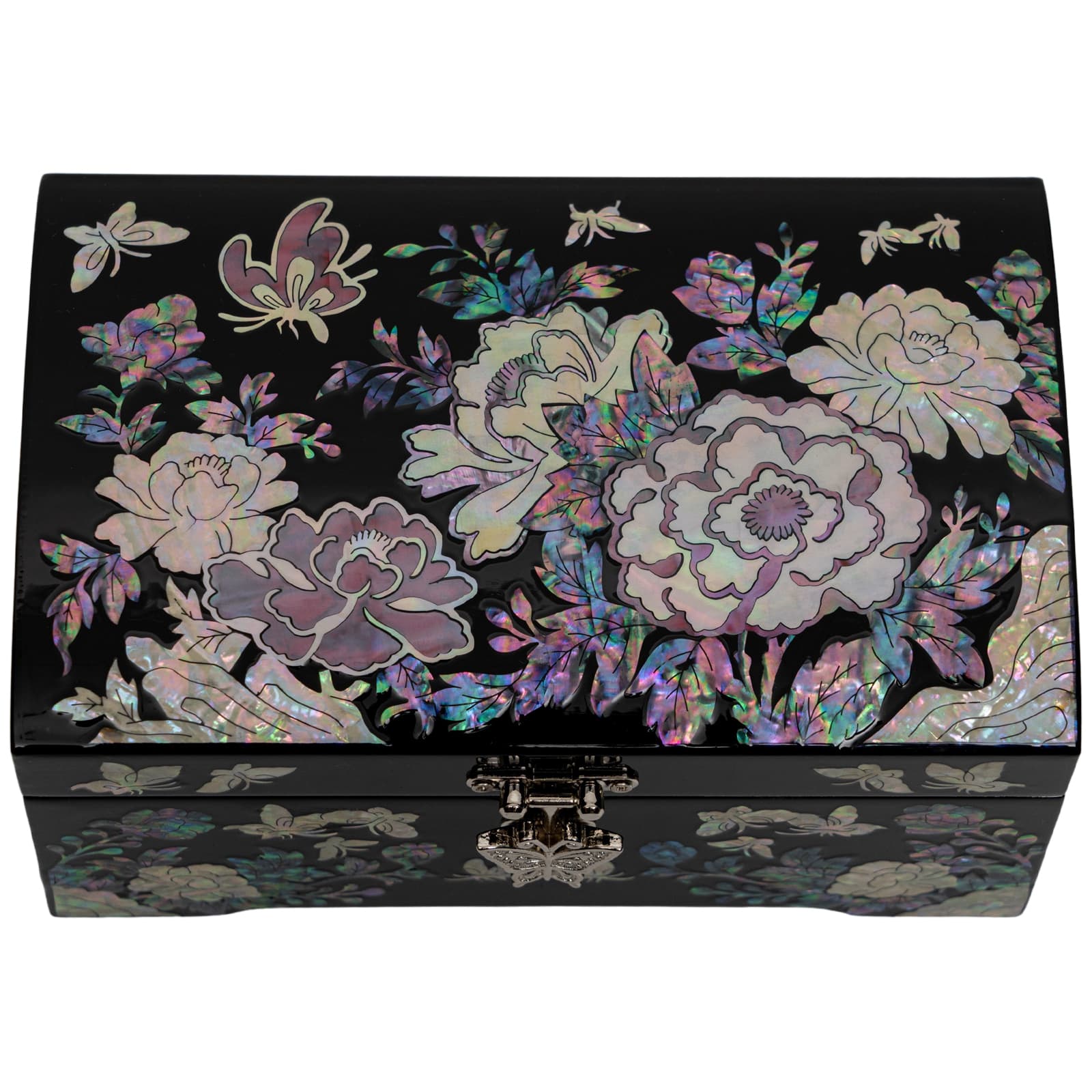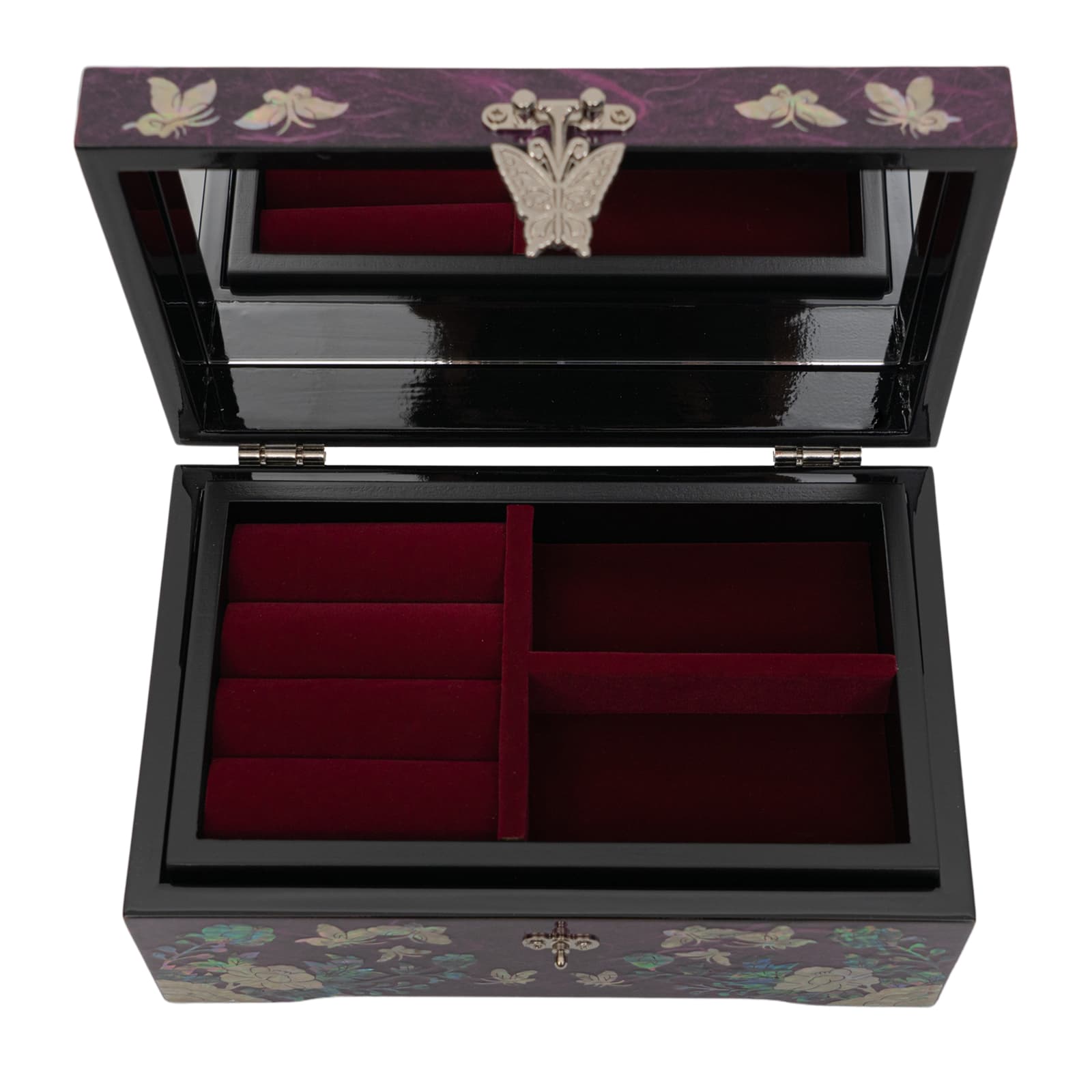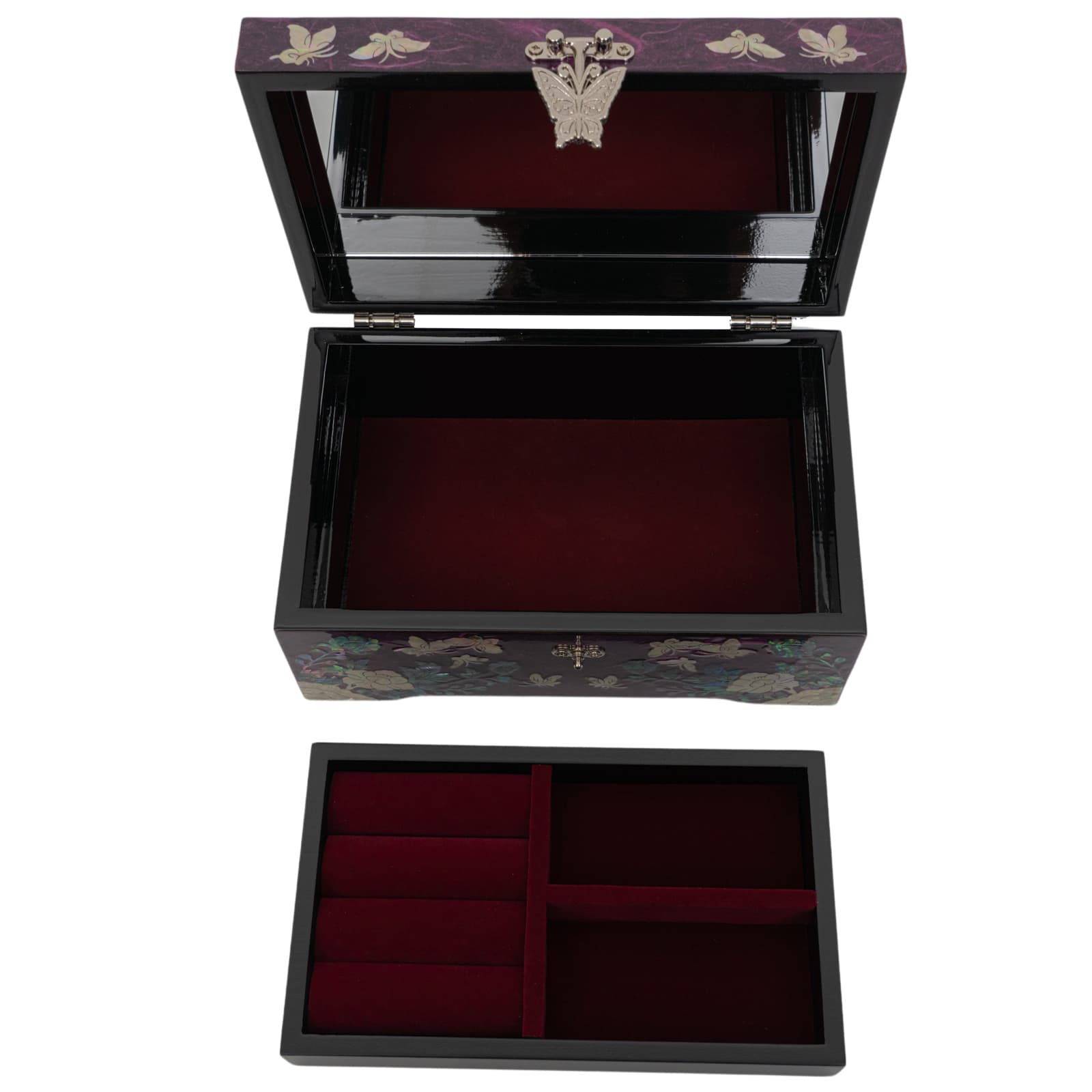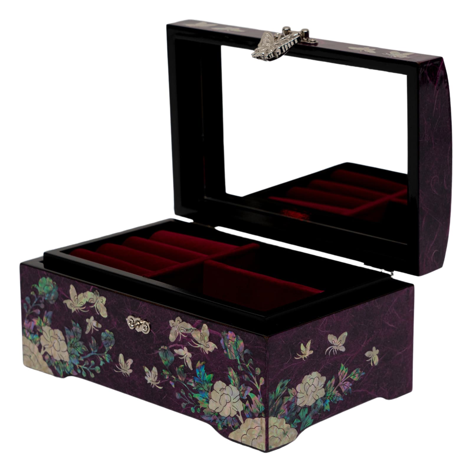 This intricately designed jewelry box is unlike any other! Its glossy lacquer finish, mother of pearl inlay, and delicate metal details make it a true masterpiece. Each box is handmade by a certified Korean craftsman with over 30 years of experience, so you can be sure that it is of the highest quality. The stunning butterflies and lotuses on the lid will captivate you, while the luminous finish makes this piece perfect for showcasing your most prized jewelry.