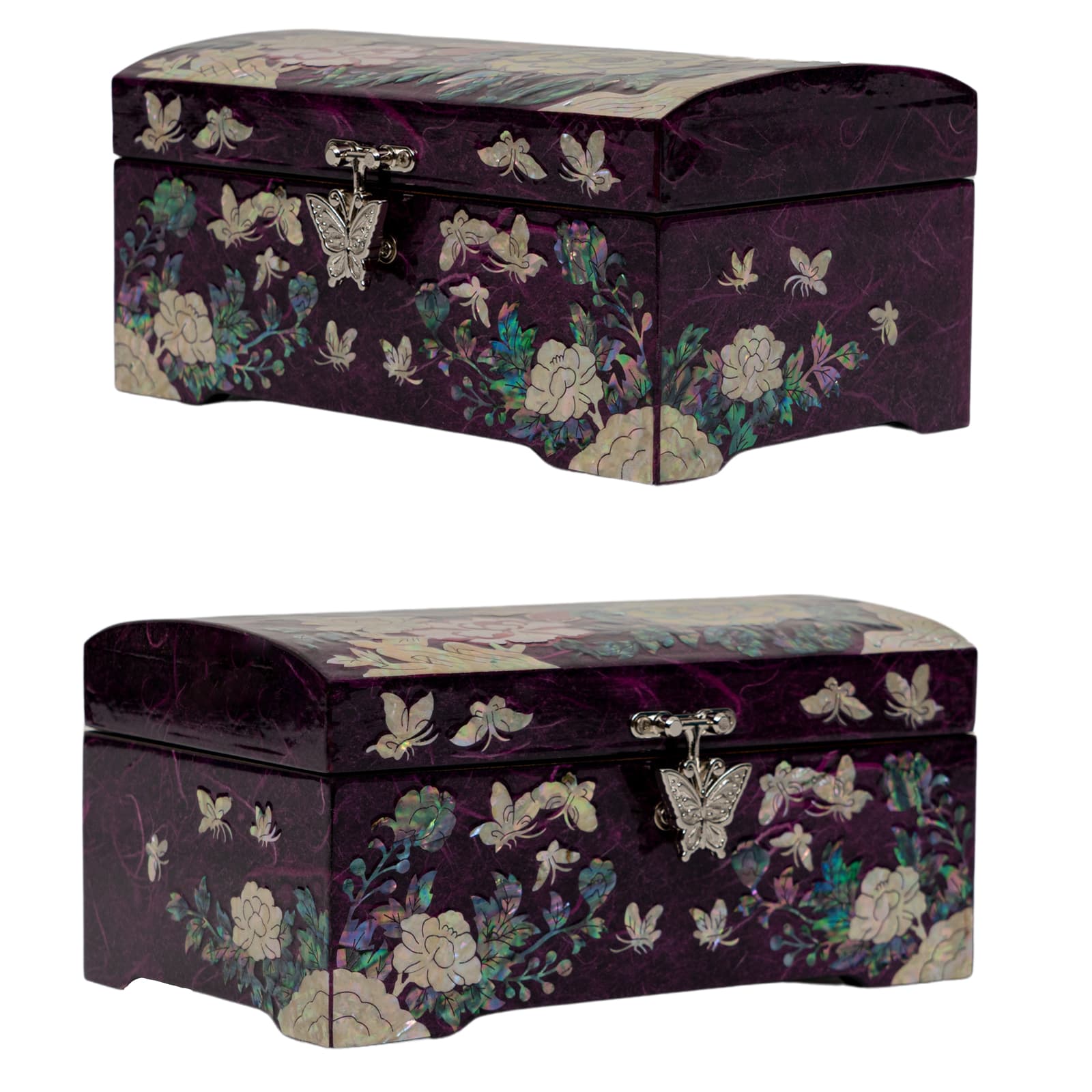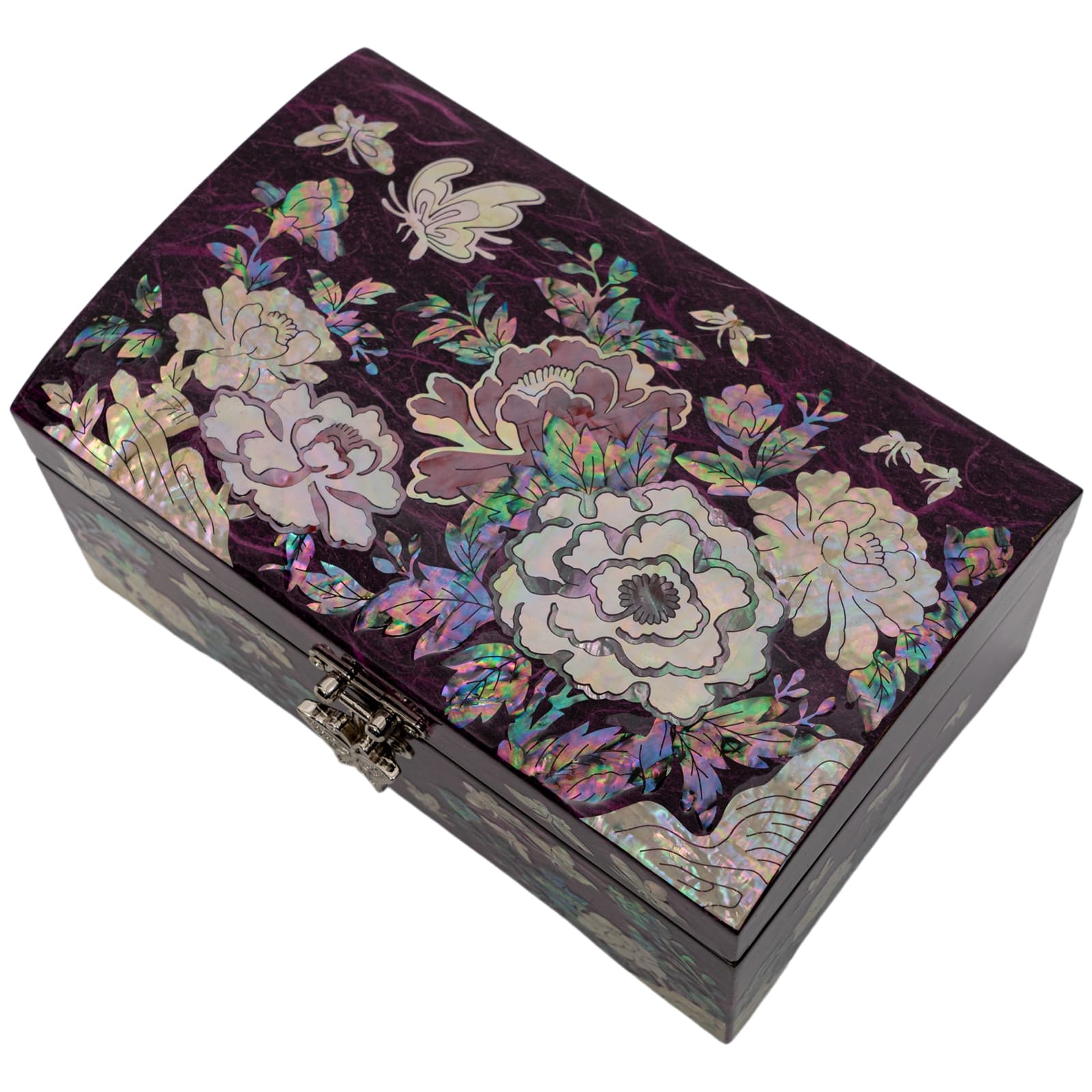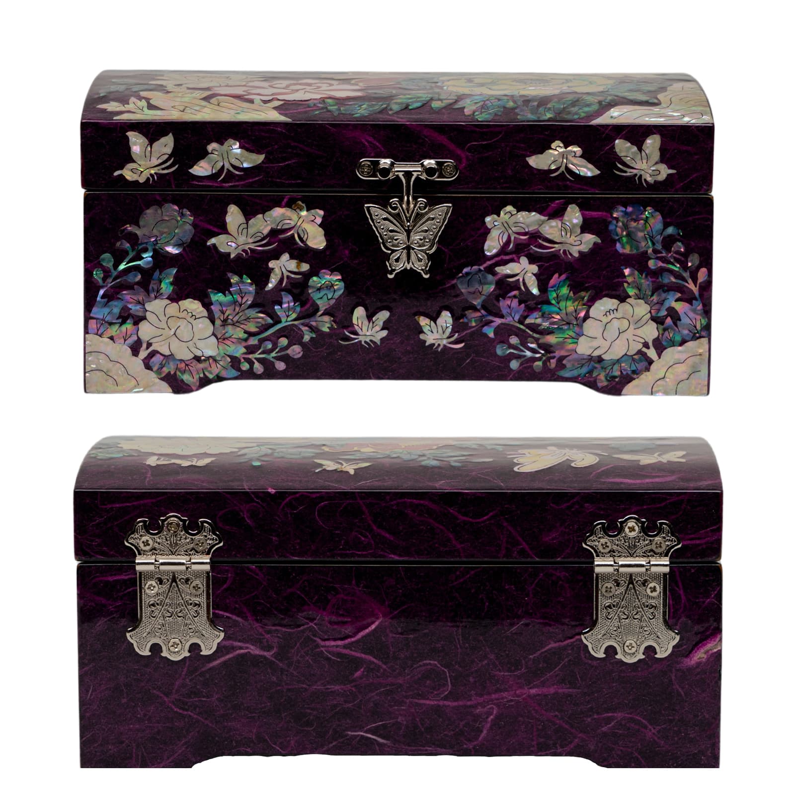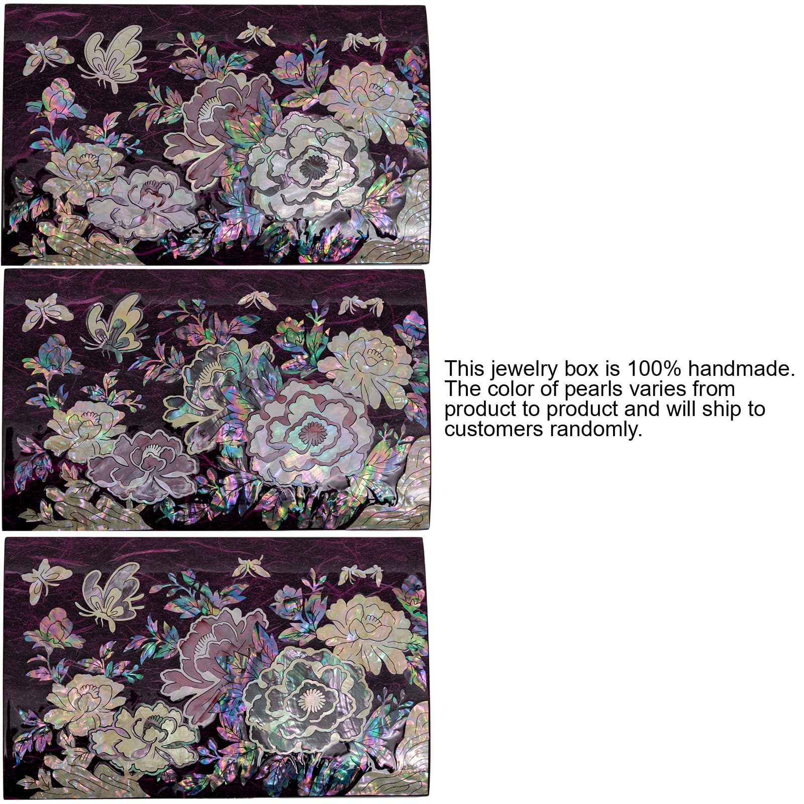 This intricately designed jewelry box is unlike any other! Its glossy lacquer finish, mother of pearl inlay, and delicate metal details make it a true masterpiece. Each box is handmade by a certified Korean craftsman with over 30 years of experience, so you can be sure that it is of the highest quality. The stunning butterflies and lotuses on the lid will captivate you, while the luminous finish makes this piece perfect for showcasing your most prized jewelry.