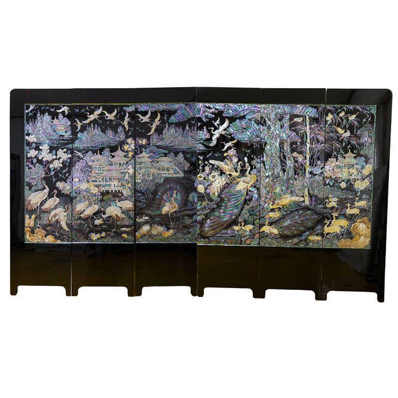 - 6 folding panels with detailed abalone inlay: cranes, peacocks, bamboo, flowers, temples